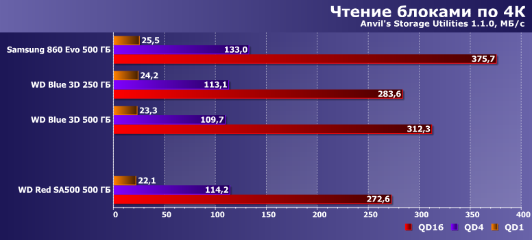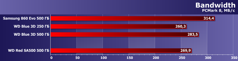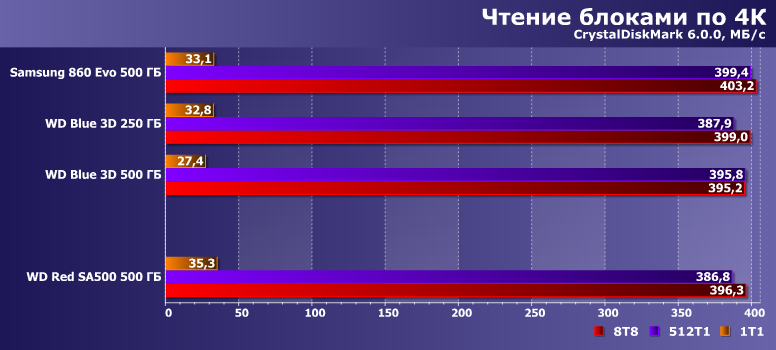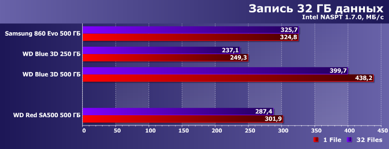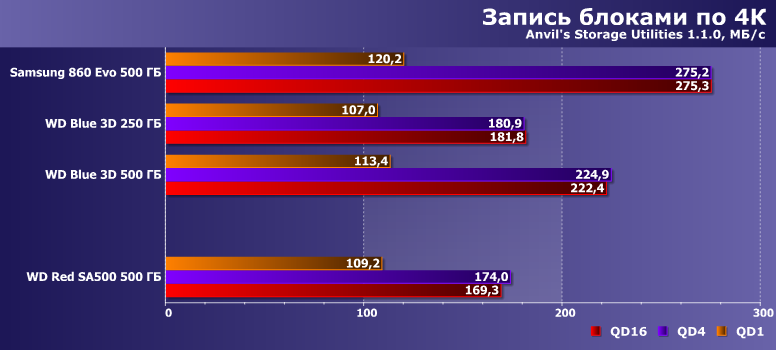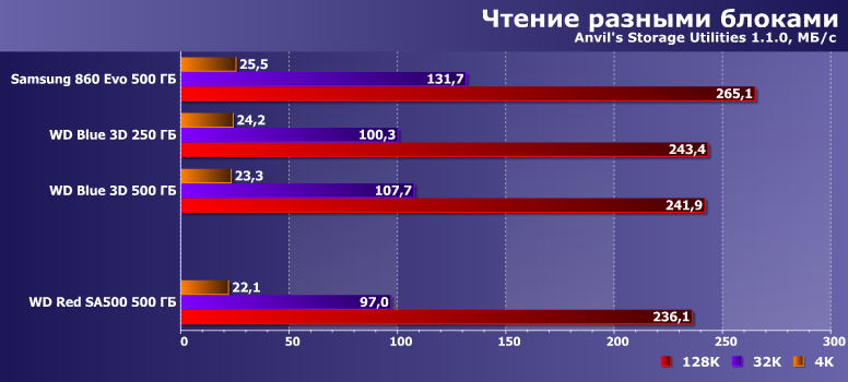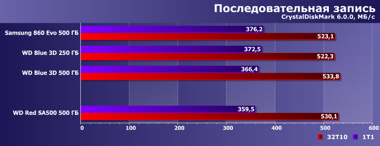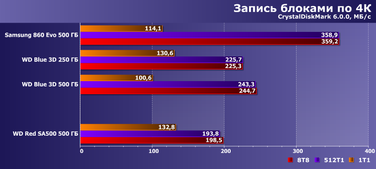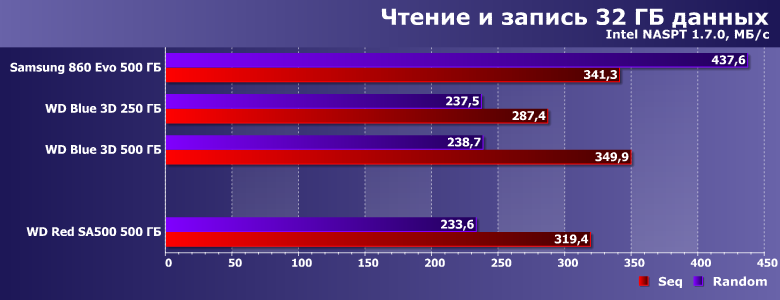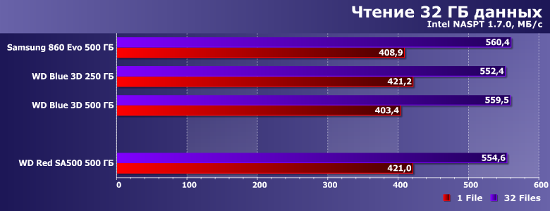 Как и следовало ожидать, при одинаковой общей емкости в 500 ГБ, использующий кристаллы по 256 Гбит WD Blue 3D на записи убедительно обходит Samsung 860 Evo и WD Red SA500 — в их случае производительность сдерживают именно 512 Гбит на кристалл. Но такая конфигурация экономически более выгодная — а для Red и достаточная. Вспоминая его основное целевое назначение, главной задачей является «обгон» жестких дисков при достаточной емкости, так что «пятисотка» — младшая в линейке, а накопители большей емкости и работать будут тоже быстрее.