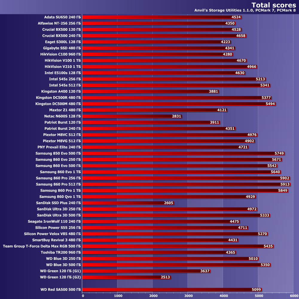 Хотя и к этим сценариям можно отнести сказанное выше. Традиционно они используются для сравнения разных твердотельных накопителей, благо результаты зависят «от всего»: контроллера, конкретной памяти, прошивки и т. п. Словом, тут не скажешь, что все SSD одинаковые.