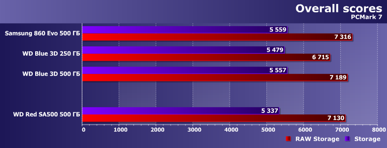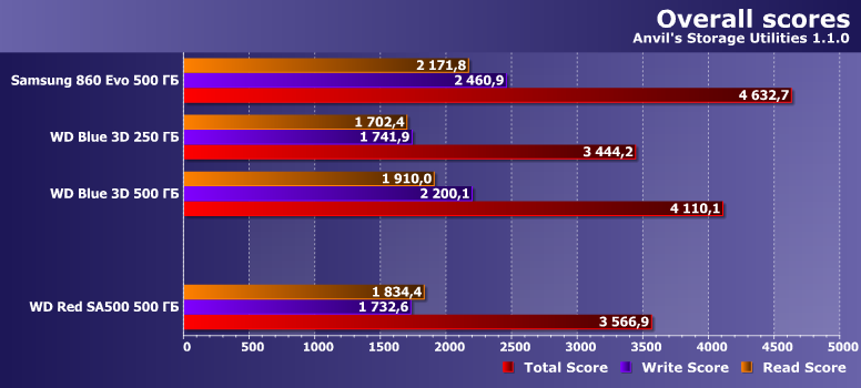 Но никаких неожиданностей произойти не могло. Как и следовало ожидать, производительность Red SA500 на 500 ГБ оказывается между WD Blue 3D на 250 и те же 500 ГБ. И вообще — в этом классе и в этих сценариях все накопители давно равны как на подбор. Поэтому выбирать приходится по другим критериям. Хотя это как раз в какой-то степени на руку именно Red — спокойнее с ним при таких условиях гарантии. Не то, чтоб Blue «не хватало» — а просто спокойнее.