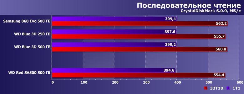 К нам же в руки попала как раз младшая в этой линейке модификация — к которой применимо все вышесказанное. Но мы все-таки протестируем ее производительность — не потому, что ожидаем каких-то рекордных результатов, а как раз чтобы понять — от чего придется «отказываться» ради большего гарантийного ресурса. Поэтому основными образцами для сравнения будут WD Blue на 250 и 500 ГБ — производительность Red SA500 500 ГБ должна как раз оказаться где-то между ними. А чтоб не было совсем скучно — добавим к списку испытуемых еще и Samsung 860 Evo на 500 ГБ, благо модель многим хорошо знакомая.