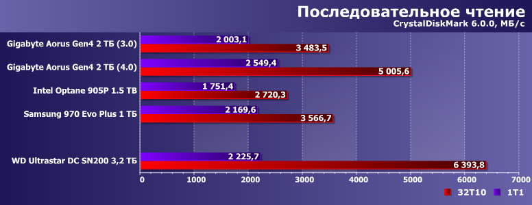 Чтение в один поток выполняется быстро, но не более того — а вот если сымитировать «большую» нагрузку, так сразу становится понятно: зачем нужен PCIe 3.0 x8. Впрочем, формально сейчас можно обойтись и четырьмя линиями, но PCIe 4.0 — однако на деле Aorus Gen4 SSD намного медленнее (при той же теоретической пропускной способности интерфейса). При этом серверных (да и каких-либо еще) платформ с поддержкой PCIe 4.0 почитай и сейчас нет — зато 3.0 х8 найти можно много где. Откуда и выбор интерфейса подключения.