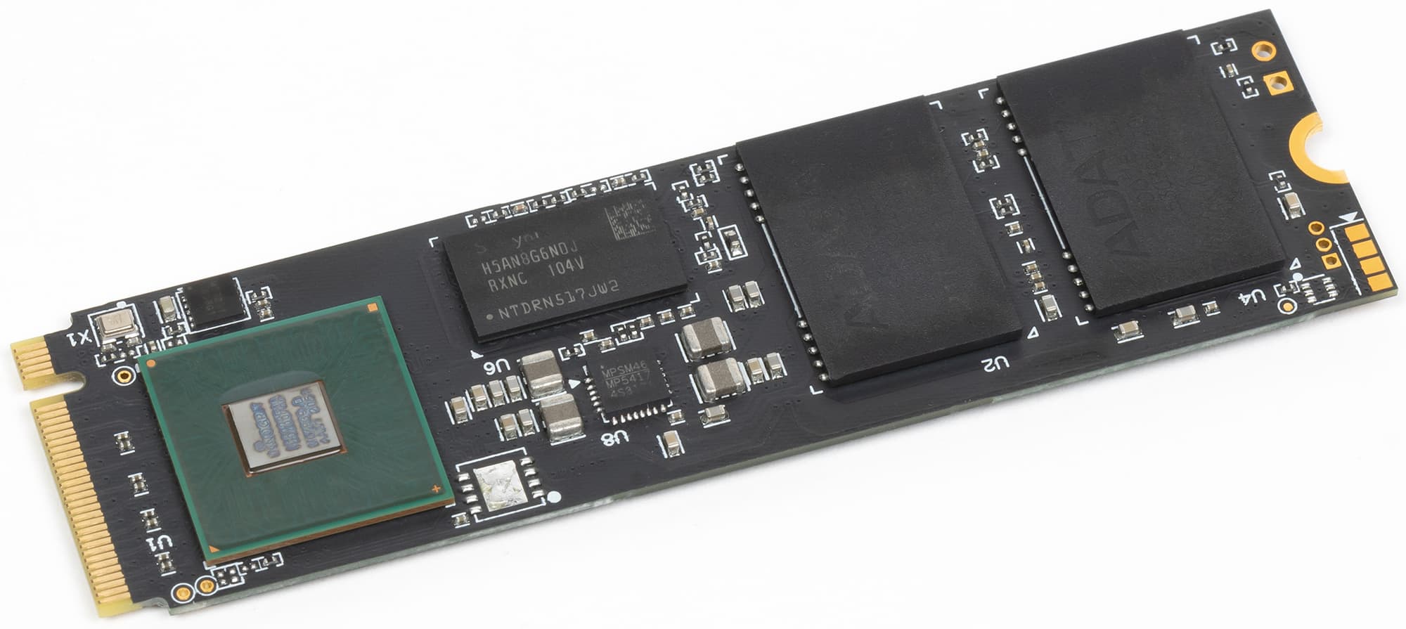 DRAM-буфер состоит из двух микросхем LPDDR-2400 от SK hynix по 1 ГБ каждая — на S50 Lite к примеру была ровно одна такая же. Кстати, Patriot Viper VP4300 выглядит практически точно также вплоть до цвета текстолита. Единственное отличие — «родная» маркировка на флэше против «собственной» у Adata (этот производитель предпочитает закупать память пластинами, а потом уже ее самостоятельно тестировать, нарезать и упаковывать). Но тут ничего удивительного: InnoGrit разрабатывает не только контроллеры, но и референсный дизайн накопителей, и прошивки, что упрощает работу партнеров. Marvell так делать не любил — за что и поплатился потерей рынка, да и, возможно, очень толковых сотрудников.