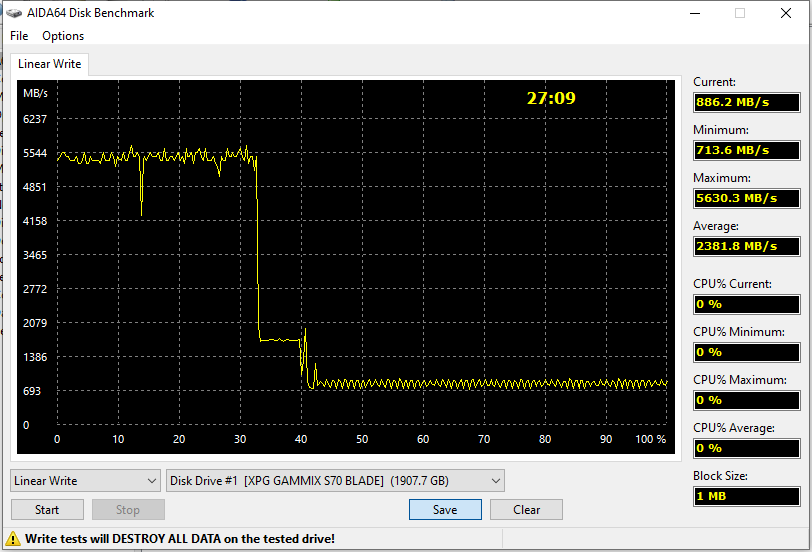 Полная пропись данными в AIDA64 выглядит типично. Как мы уже говорили, все современные SSD на базе TLC- и (особенно) QLC-памяти спринтеры — быстро пишут лишь в пределах SLC-кэша, под который могут отводить вплоть до всех свободных ячеек. Переход на PCIe 4.0 ситуацию только усугубил — как раз скорость кэша и повысилась, а вот собственные возможности той же памяти, разумеется, остались теми же. Но в целом выглядит симпатично: 5,5 ГБ/с в ускоренном режиме — это хорошо. Да и 700-800 МБ/с за пределами кэша тоже нормально.