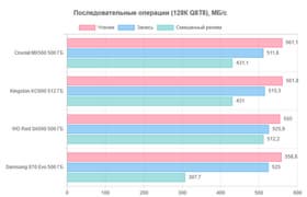 18 дек 2023 19:30 91 Твердотельный накопитель Samsung 870 Evo емкостью 500 ГБ: последний выживший на рынке условно топовый SATA SSD В PCMark 10 Storage Full System Drive поставлен рекорд — рискующий стать уже абсолютным, поскольку вряд ли кто-то из производителей выпустит более быстрый SATA-накопитель, а существовавшие конкуренты давно перешли в категорию исчезнувших. Правда, на основании знаний об особенностях внутреннего устройства были предположения, что Samsung 870 Evo будет безоговорочным лидером вообще везде, где это возможно, и окажется на равных со всеми остальными, когда обогнать их невозможно. Может быть, подобное и получилось бы при тестировании SSD более высокой емкости. Но мы для этой серии тестов избрали объем 500 ГБ, а в таком объеме слишком уж хорошо выглядят последние версии Kingston KC600 и Crucial MX500, появившиеся немногим позже, чем Samsung 870 Evo (176-слойная TLC-память у Micron получилась очень удачной и недорогой).