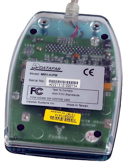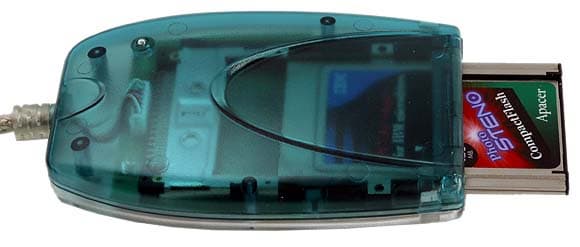 1. Через устройство Data FAB FireWire MD1-II-FV PCMCIA Card Reader. Как видно из названия, это устройство подключается к компьютеру через FireWire или, по-другому говоря, через IEEE 1394. Хотя физически в него можно вставить любую PC Card, но предназначено оно исключительно для карт памяти, недаром в названии фигурирует именно PCMCIA (Computer Memory Card International Association), и попытки заставить через него работать Multiple Function PC Cards обречены на неудачу. Устройство подключается к компьютеру через 6-контактный разъем и питается только через него. Если на вашем ноутбуке 4-контактный разъем, то питание на устройство поступать не будет и придется воспользоваться внешним источником. К сожалению, разъема для питания на корпусе нет, и для подключения в цепь придется включить FireWire Hub с гнездом под разъем питания. Например, ATEN FH-300, и уж к нему имеющийся блок питания. Таким образом, даже для компьютеров с IEEE 1394 проблема быстрого ввода решается не всегда очень просто.