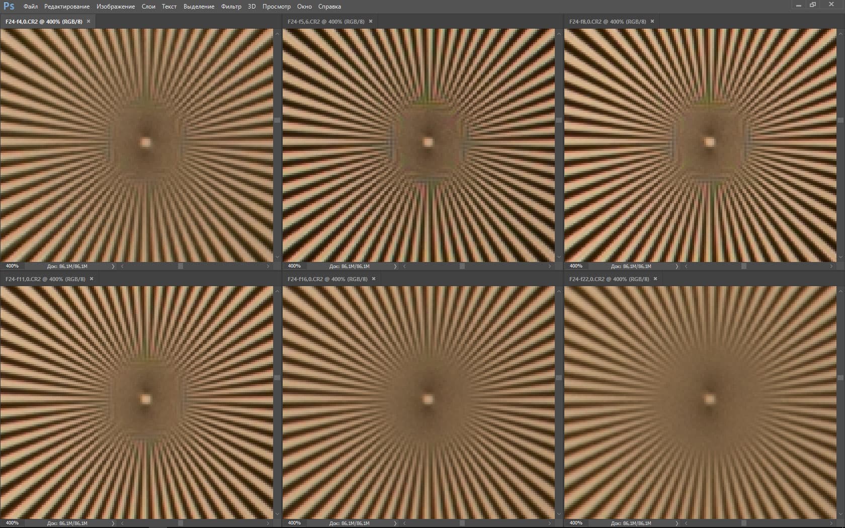 Мы начнем просматривать характеристики «подопытного» с короткого фокусного расстояния — 24 мм. Это фокусное расстояние считается широкоугольным, хотя границы «широкоугольности» условны.