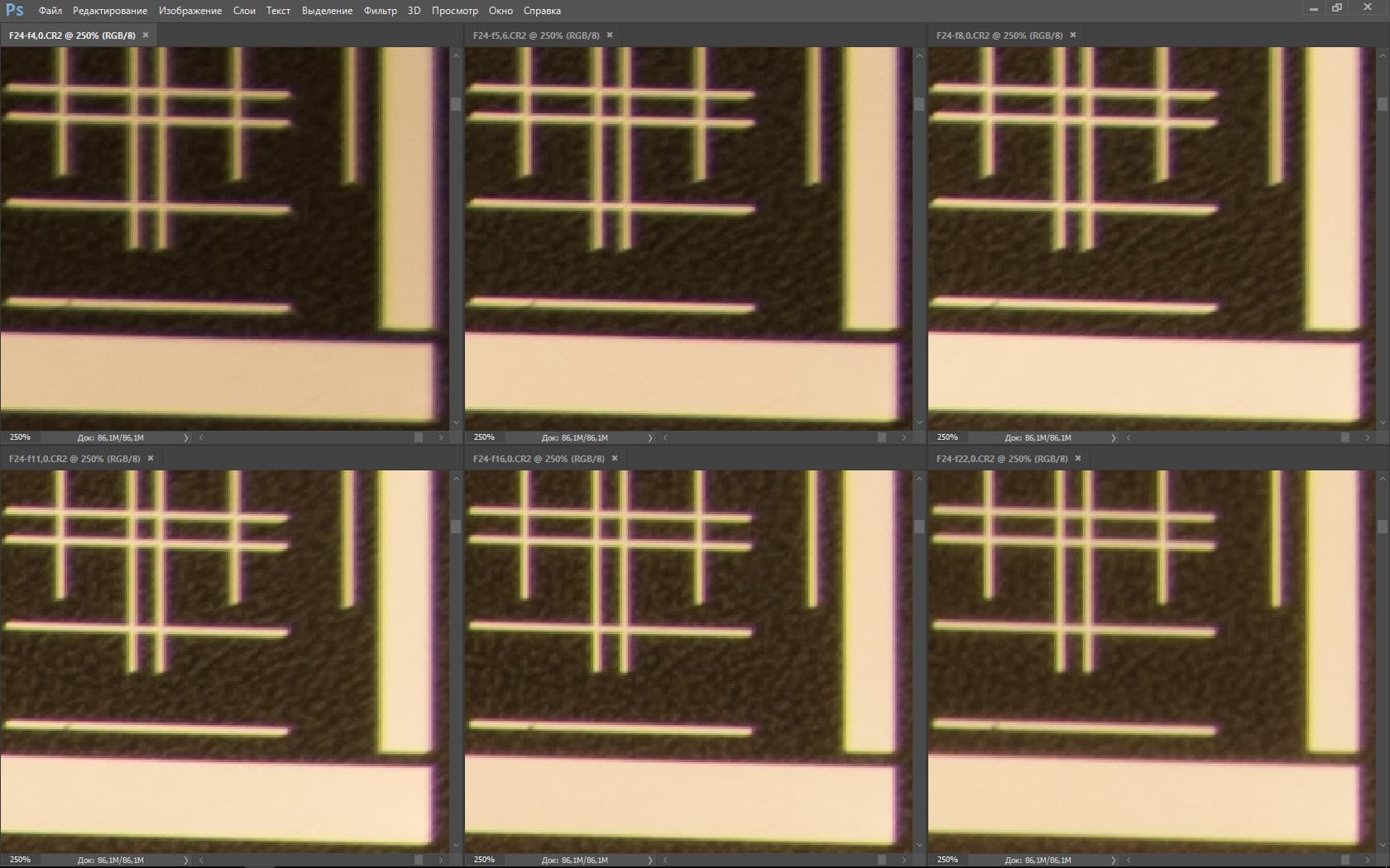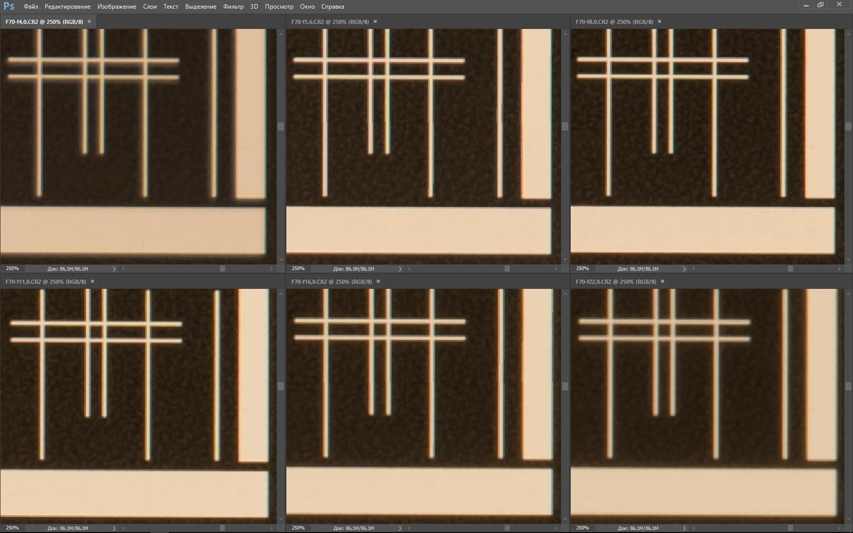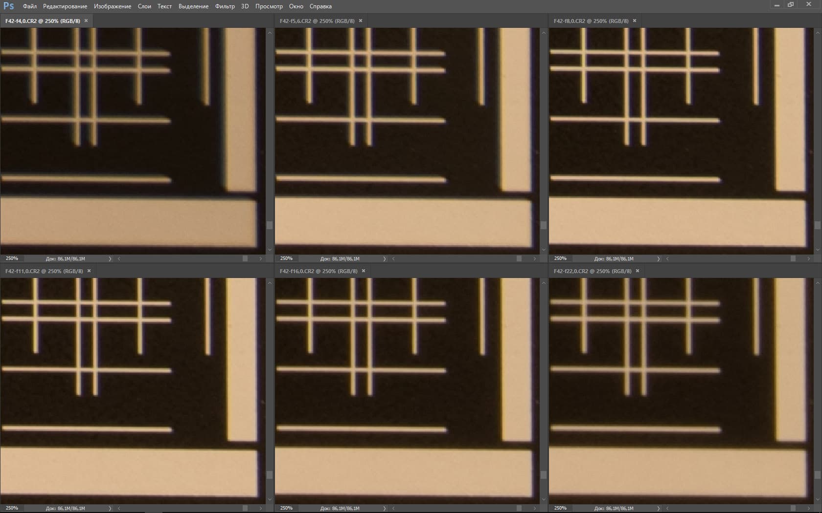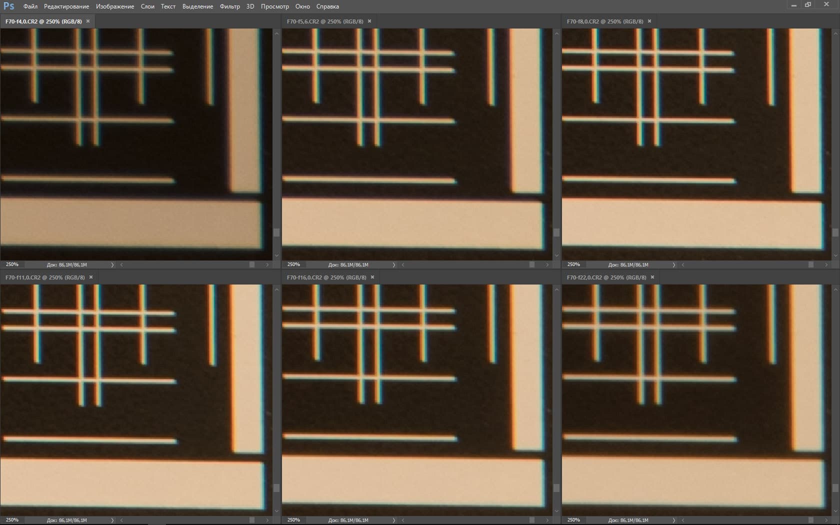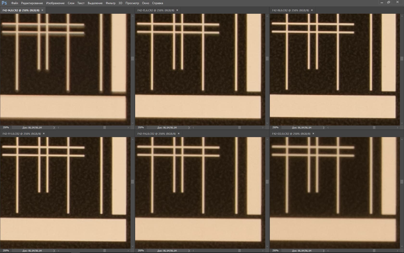 | На всех скриншотах верхний ряд: f/4,0 — f/5,6 — f/8,0, нижний ряд: f/11 — f/16 — f/22 | |||