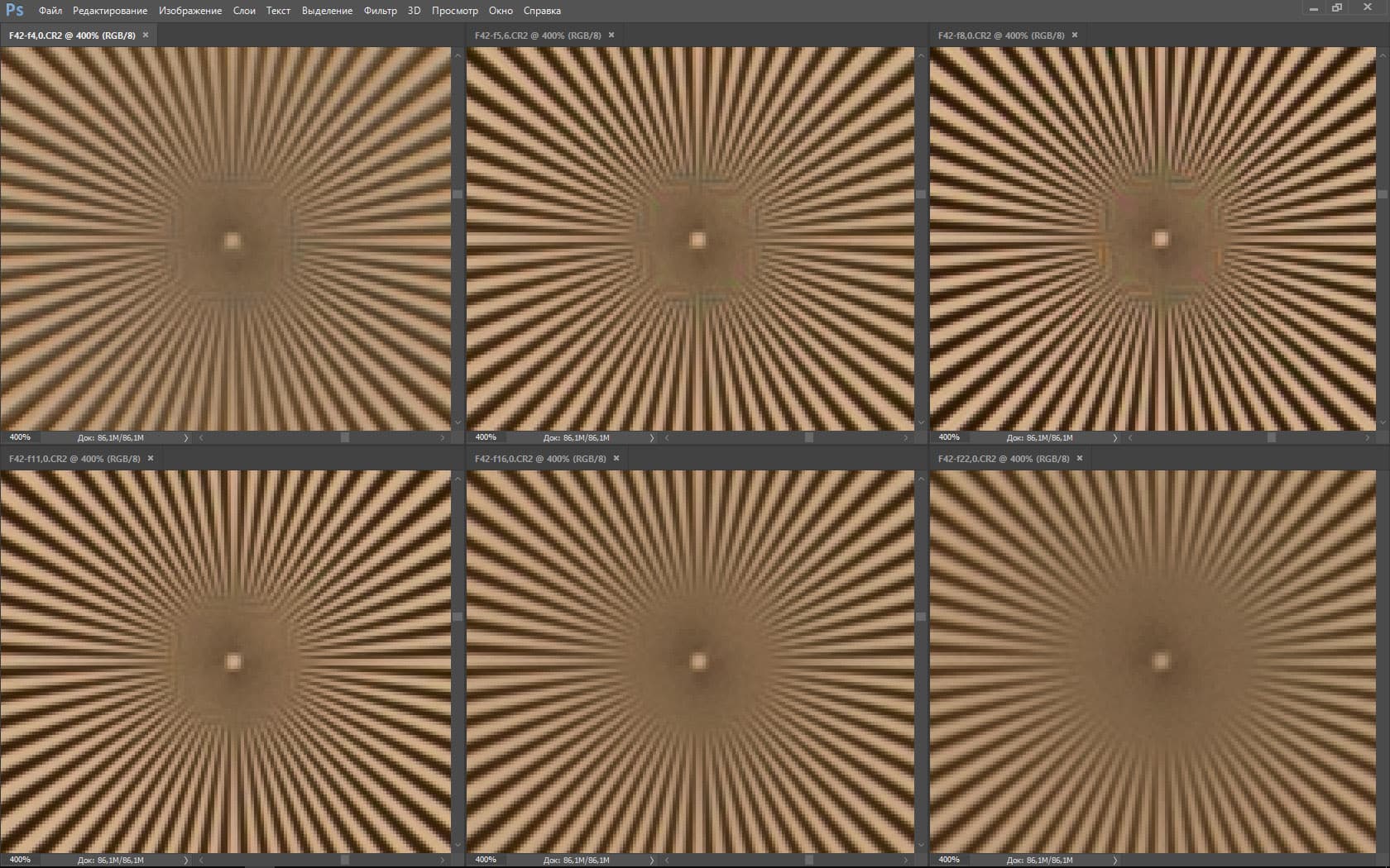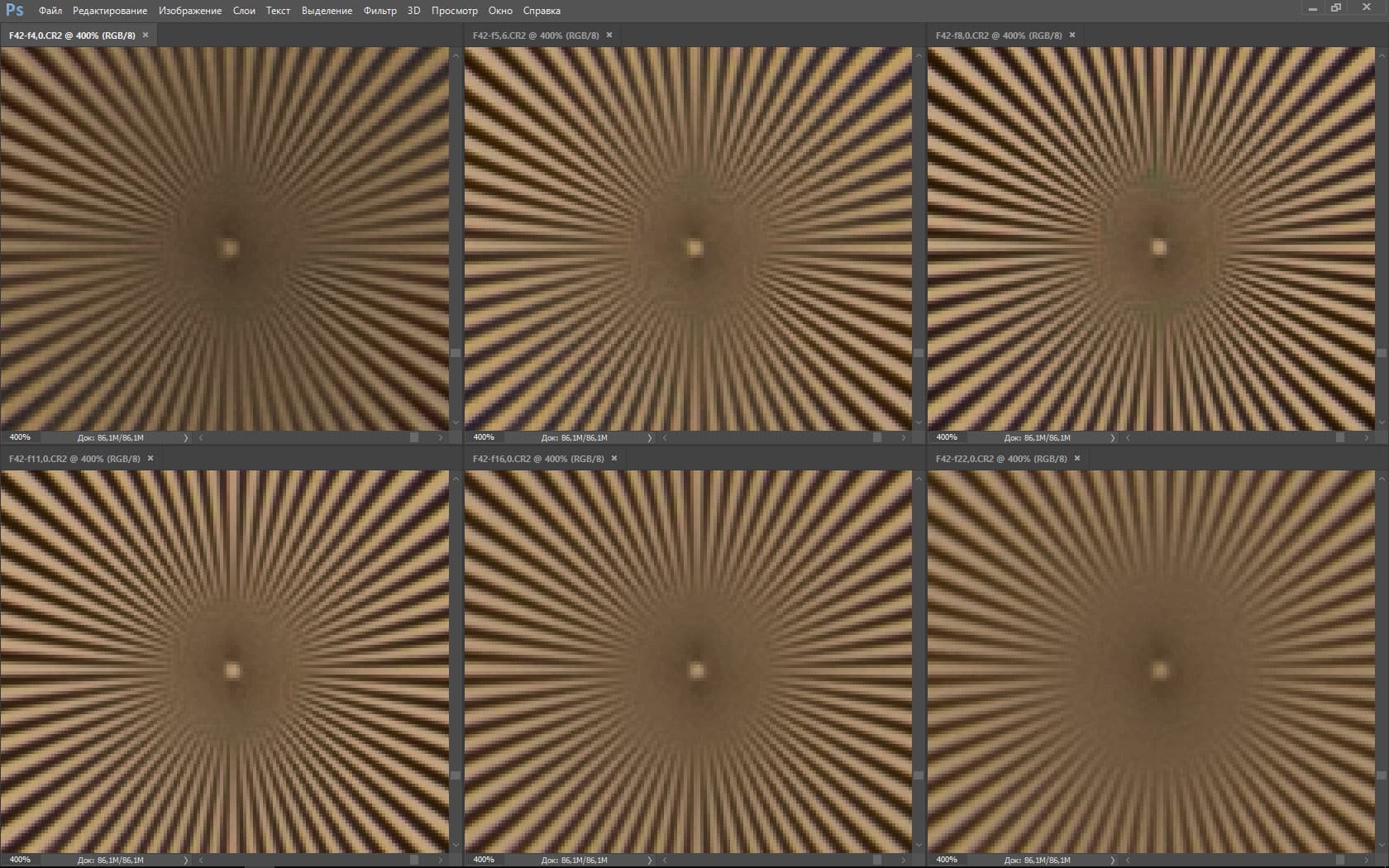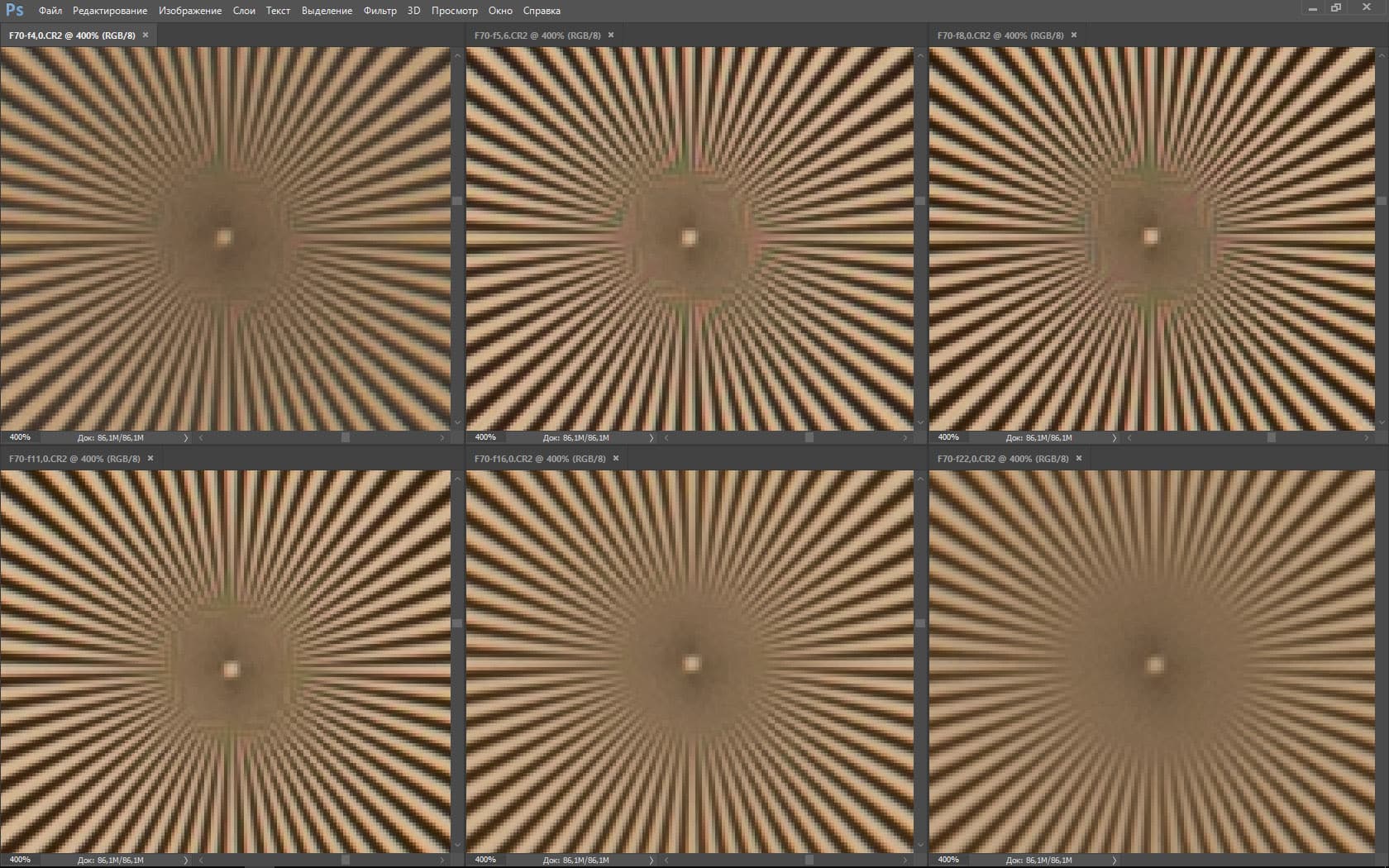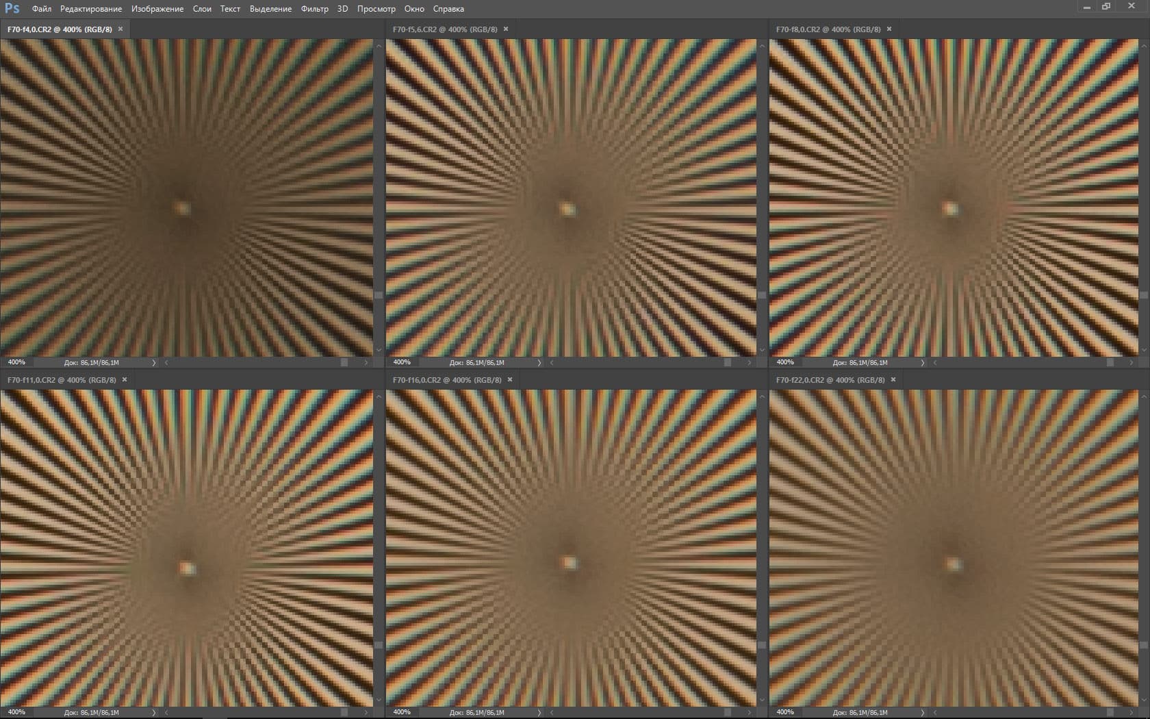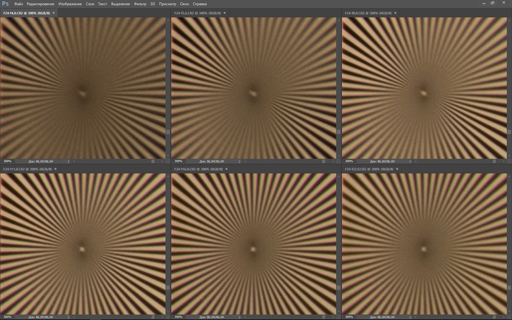 | На всех скриншотах верхний ряд: f/4,0 — f/5,6 — f/8,0, нижний ряд: f/11 — f/16 — f/22 | |||