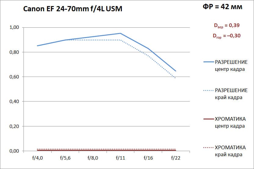 Переходим к среднему фокусному расстоянию 42 мм. Здесь мы видим почти полностью выправленною дисторсию, с искажениями по горизонтали и вертикали меньше 0,5.
