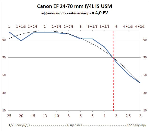 Как видите, мы зафиксировали эффективность стабилизатора на уровне чуть ниже, чем 4 ступени EV, что почти совпадает с данными производителя. Наш метод «страдает» погрешностью порядка 1/3 ступени, так что общий вывод теста стабилизатора такой: мы подтверждаем высокую эффективность оптического стабилизатора, она действительно находится на уровне порядка 4 ступеней. (Наша методика тестирования стабилизатора подробно описана в статье о Nikon D5300.)