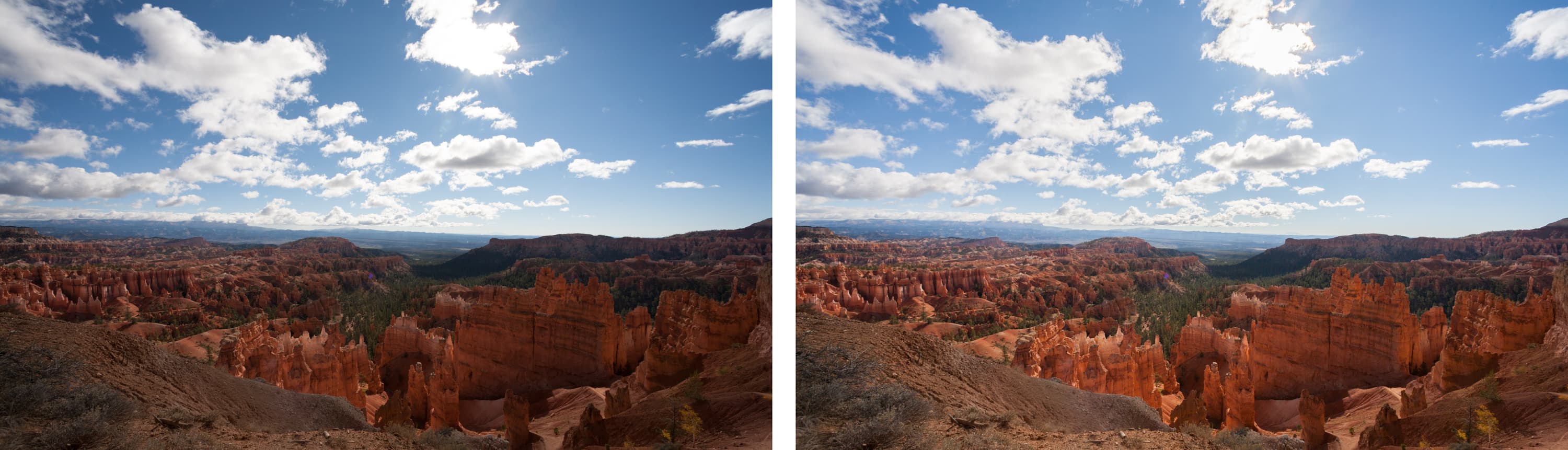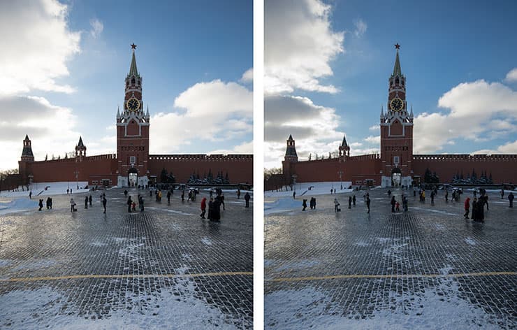 На фото, приведенных ниже, вариант слева представляет собой «проявку» CR-файла в Adobe Camera RAW без вытягивания деталей в светах, а справа — с попыткой извлечь из пересвеченных зон утраченные подробности.