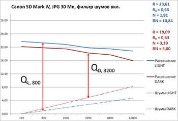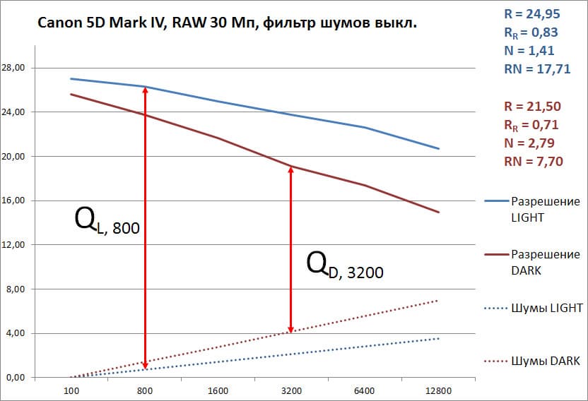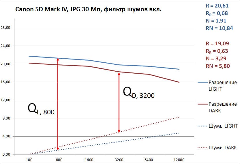 Но в итоге мы получили характеристики Canon EOS 5D Mark IV. Она при более высоком разрешении обгоняет Nikon D610 по шумам, то есть шумит слабее. И хотя по шумам отстает от Canon EOS 1D X Mark II (шумит сильнее), но по разрешению заметно выигрывает у флагмана Canon.