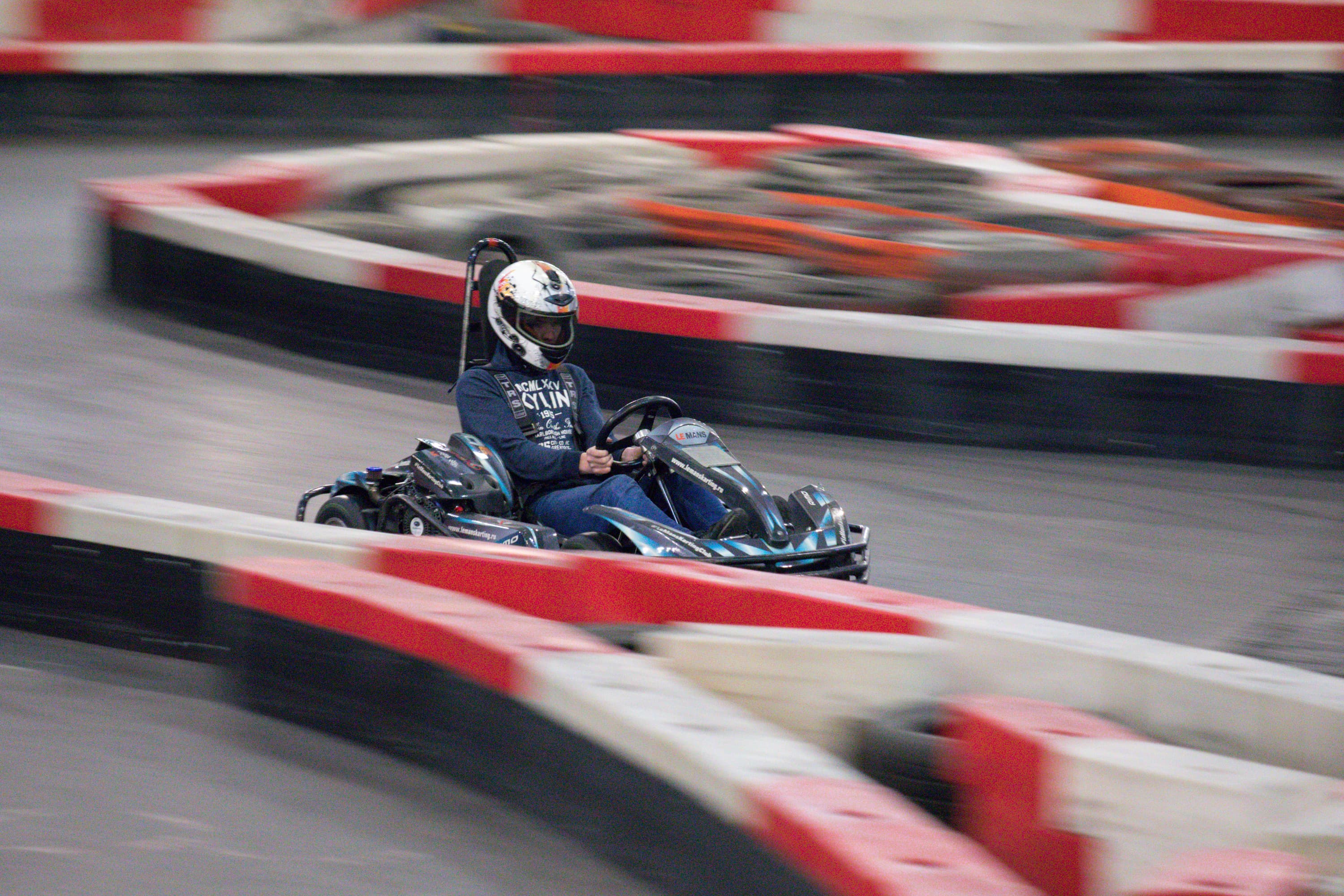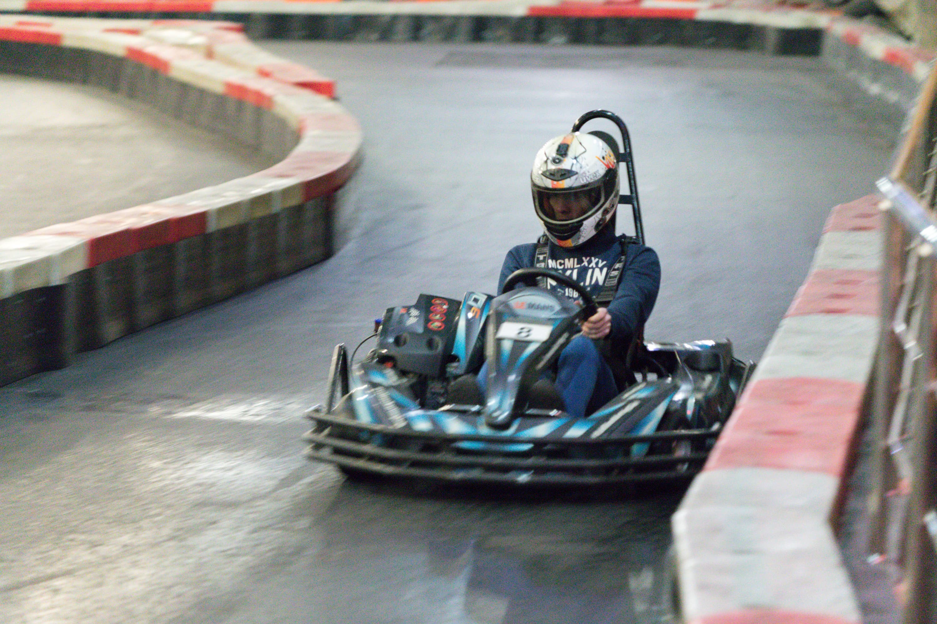 В помещении при съемке соревнований по картингу мы использовали тот же телеобъектив Canon EF 70-300mm f/4-5.6 IS II USM, но активировали однократный автофокус. Снимали «впроводку», то есть ведя объект по трассе, чтобы добиться «смаза» фона за счет длительной выдержки.