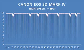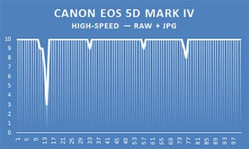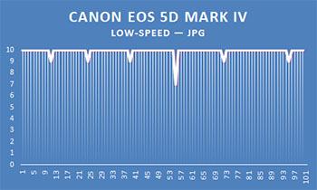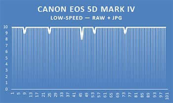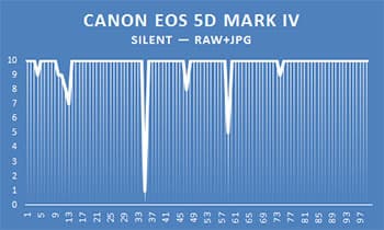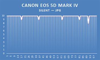 И отдельный забег мы провели для режима тихой серийной съемки. Кстати, в этом режиме Canon EOS 5D Mark IV не щелкает, а шелестит, то есть работает действительно тихо. Этот режим очень похож на Low Speed: при съемке JPEG камера может «щелкать» до заполнения карты памяти со скоростью 3 кадра в секунду. А при съемке RAW+JPEG делает 10 кадров со скоростью 3 fps, а потом переходит в «бесконечную» съемку со скоростью 1,2 fps.