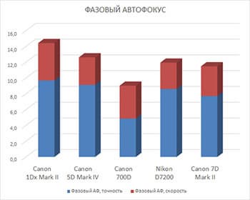 На диаграммах мы видим, насколько быстр и точен покадровый автофокус Canon EOS 5D Mark IV по сравнению с АФ других фотокамер. Здесь синяя часть столбика показывает точность автофокуса (максимум — 10 баллов), а красная часть столбика — его скорость. Скорость рассчитывается по формуле «200, деленное на суммарное время, затраченное в тестах −1 EV и −2 EV».