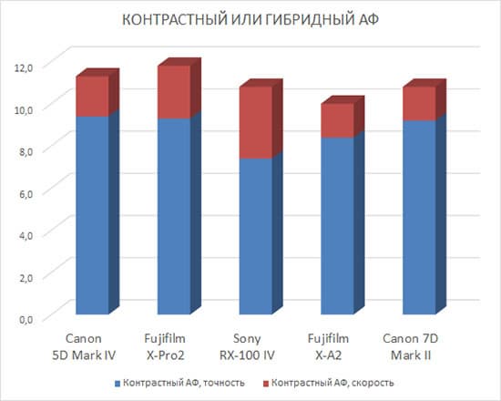 И напоследок мы можем сравнить контрастный (гибридный) АФ Canon EOS 5D Mark IV с АФ некоторых беззеркалок. Как видите, здесь рекордсменом остается Fujifilm X-Pro2 — чуть менее точная, чем флагман Canon, но заметно более быстрая. А героиня нашего теста в режиме Live View снимает так же быстро, как Canon EOS 1D X Mark II, но не так точно. Пожалуй, про работу автофокуса Canon EOS 5D Mark IV можно сказать, что он хорошо сбалансирован по точности и скорости.
