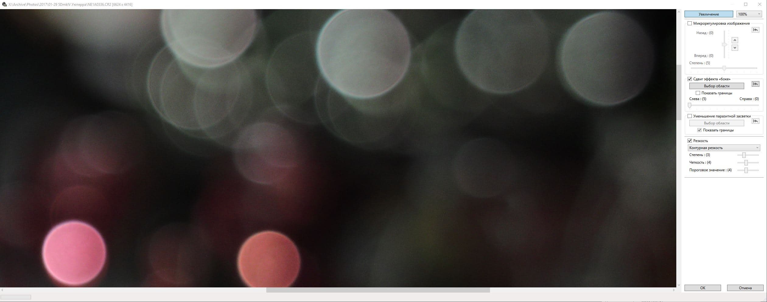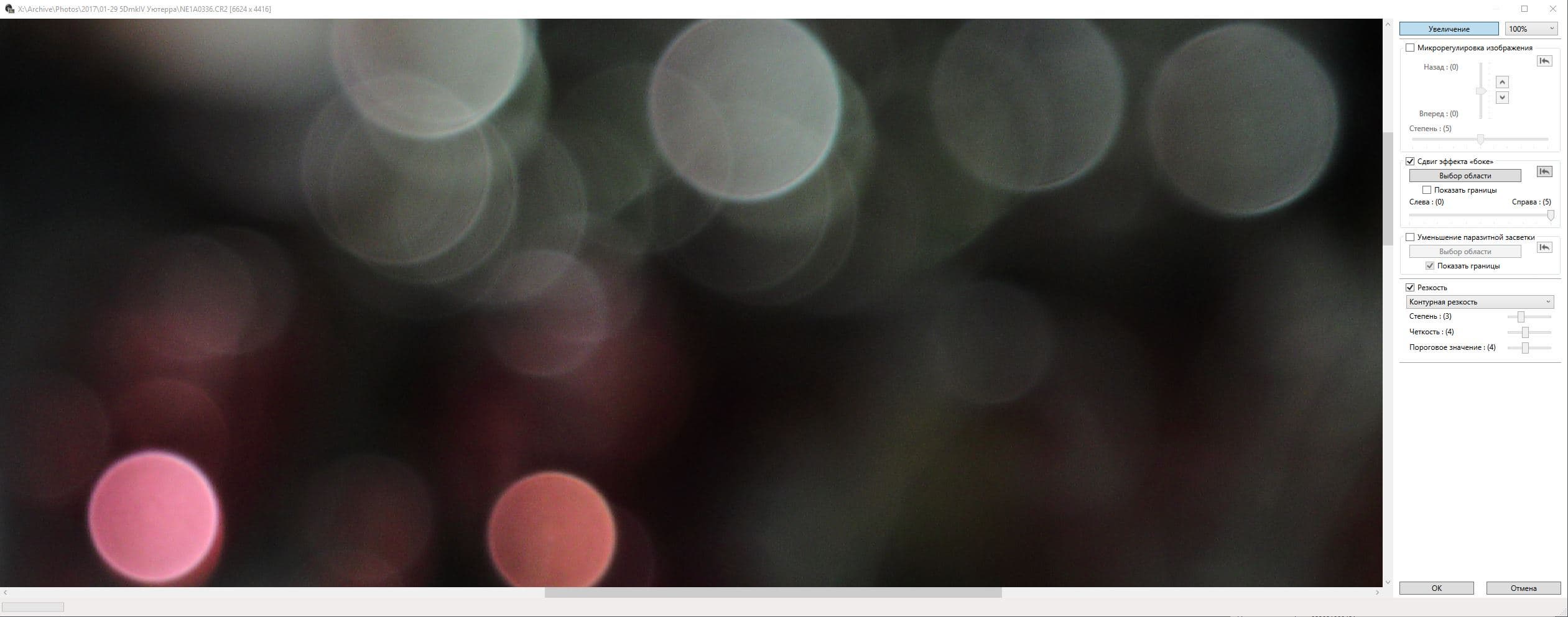 Пары светоприемных ячеек позволяют сохранять два изображения со сдвигом на величину расстояния между центрами этих пар, а это дает теоретическую возможность смещать точку фокусировки и рисунок размытия заднего плана (бокэ), корректировать паразитную засветку и увеличивать резкость картинки. Все эти операции пока позволяет осуществлять только «фирменное» приложение Digital Photo Professional 4.5, но вполне возможно, что вскоре этому научатся Adobe Camera RAW, Lightroom и другие. Давайте выясним, каков практический смысл постобработки Dual Pixel RAW для фотографа.