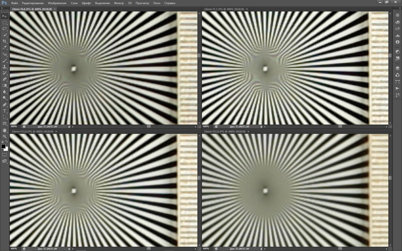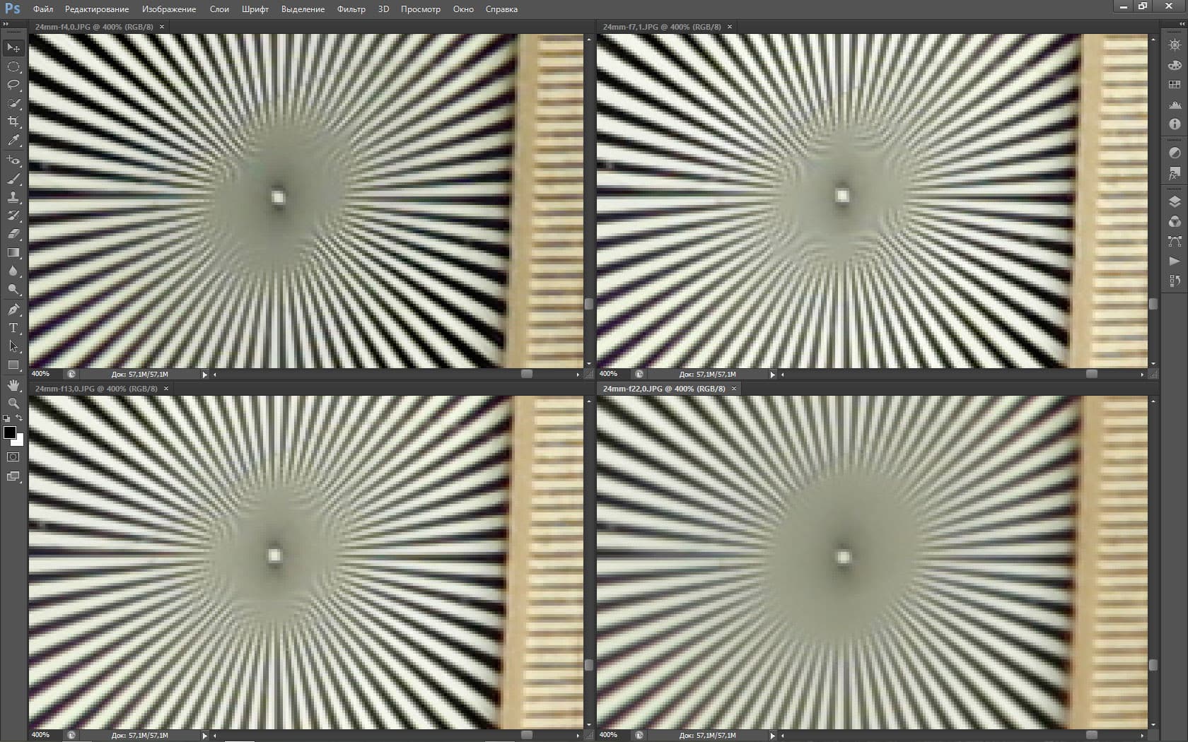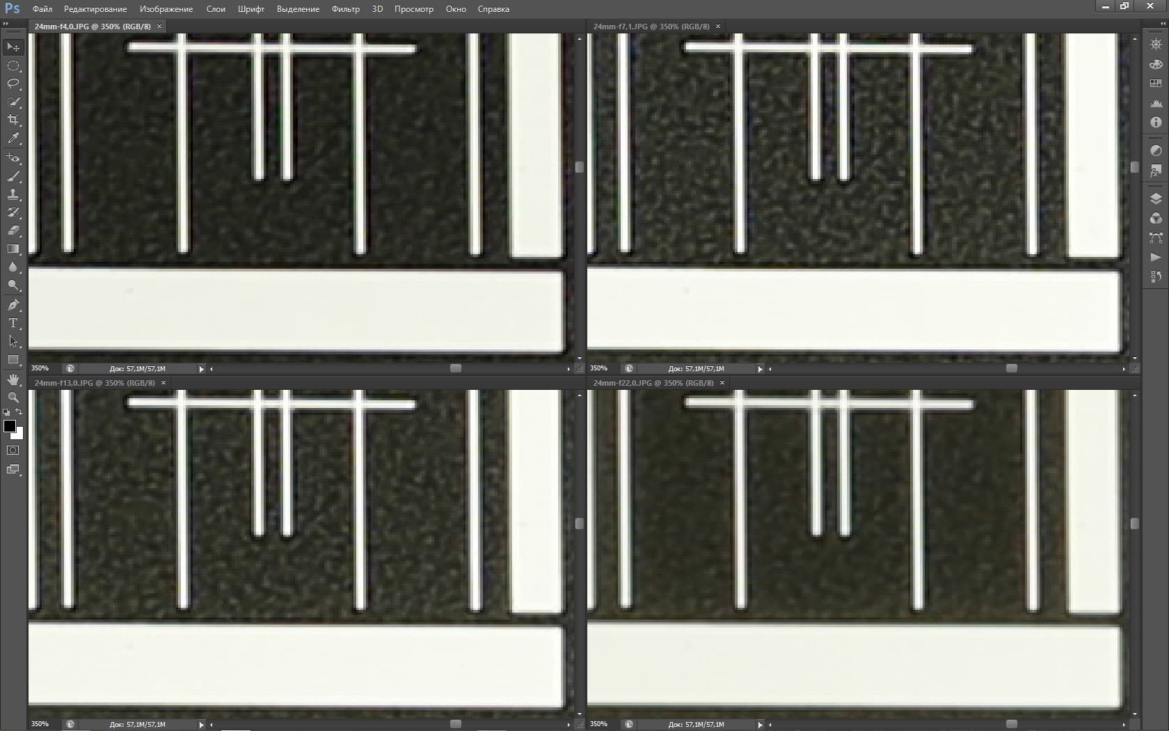 | Замеры сделаны на f/4 — f/7,1 — f/13 — f/22. | |