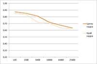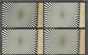 Если же перевести качество картинки в цифры (пока лучший измеритель для этого — радиальные миры; лучший, но далеко не идеальный), мы получим почти знакомые зависимости. «Почти» — потому что каждая камера дает свои показатели, но при этом характер кривых можно предсказать: разрешение RAW будет выше того, что дает JPG, примерно на 0,1 линии на пиксель.