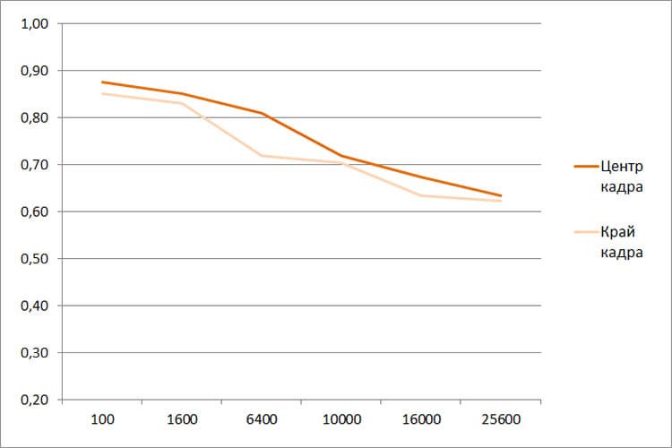 Кроме того, можно ожидать, что «мягкая» картинка Canon даст разрешение чуть ниже, чем «жесткая» от Nikon. Да, все это видно на графиках. Немного неожиданные результат получился у JPG с фильтром шумов. Обычно фильтр ослабляет разрешение JPG еще на 0,05 линии, но в случае Canon EOS 6D мы этого не наблюдаем. Кривые с выключенным и включенным фильтром идут примерно на одном уровне. Пожалуй, в этом проявляются преимущества «мягкой» картинки.