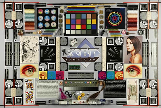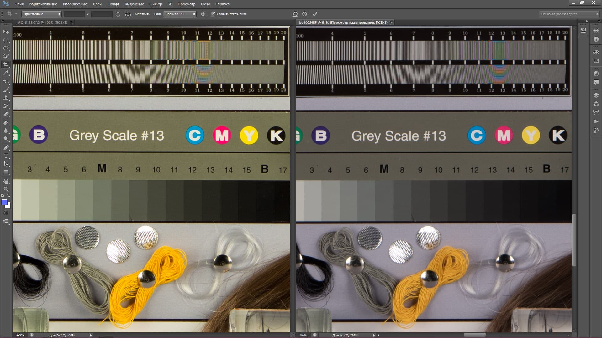 | Снимки тестового стенда: слева Canon EOS 6D, справа Nikon D750. Проявка RAW с установками по умолчанию, изменена только температура проявки — в обоих случаях это 3200 по Кельвину. |