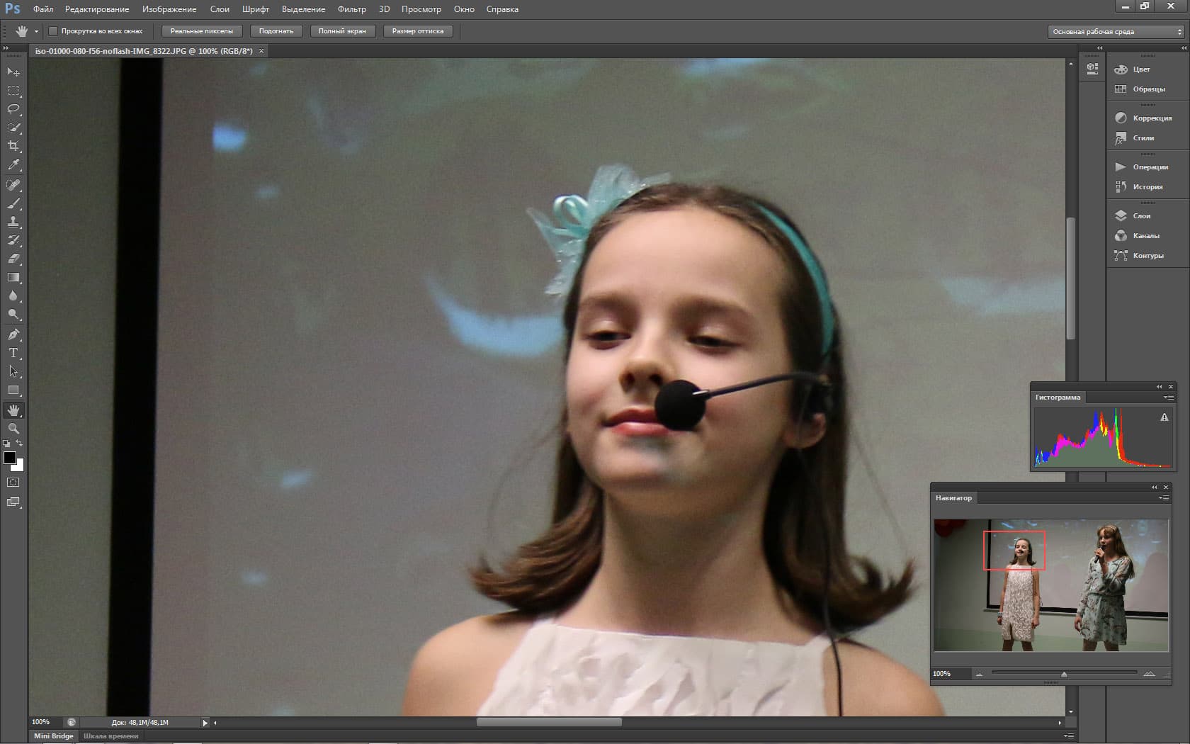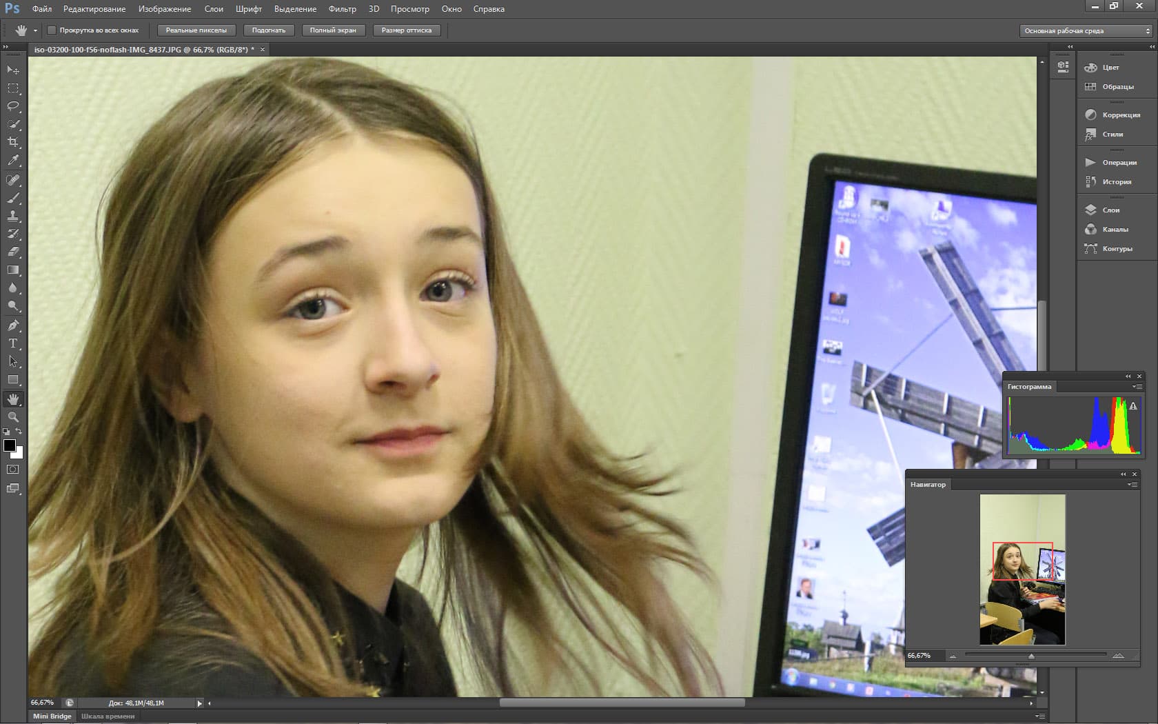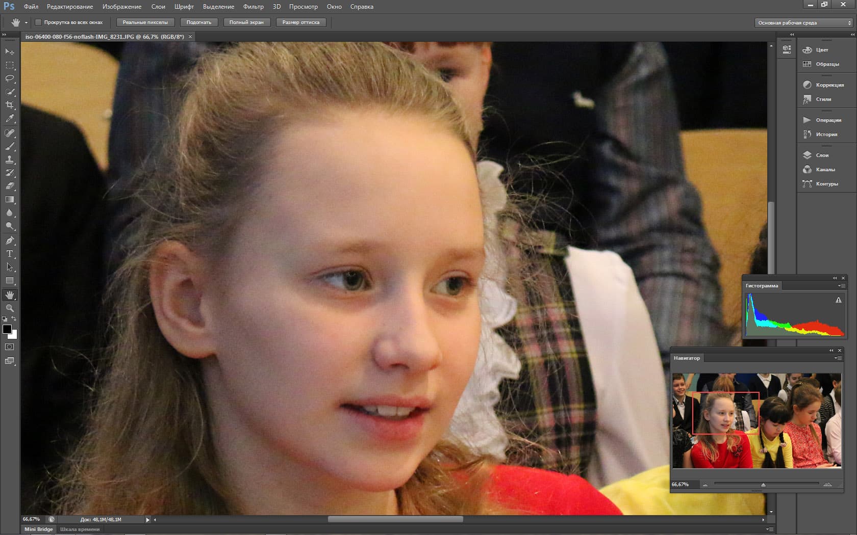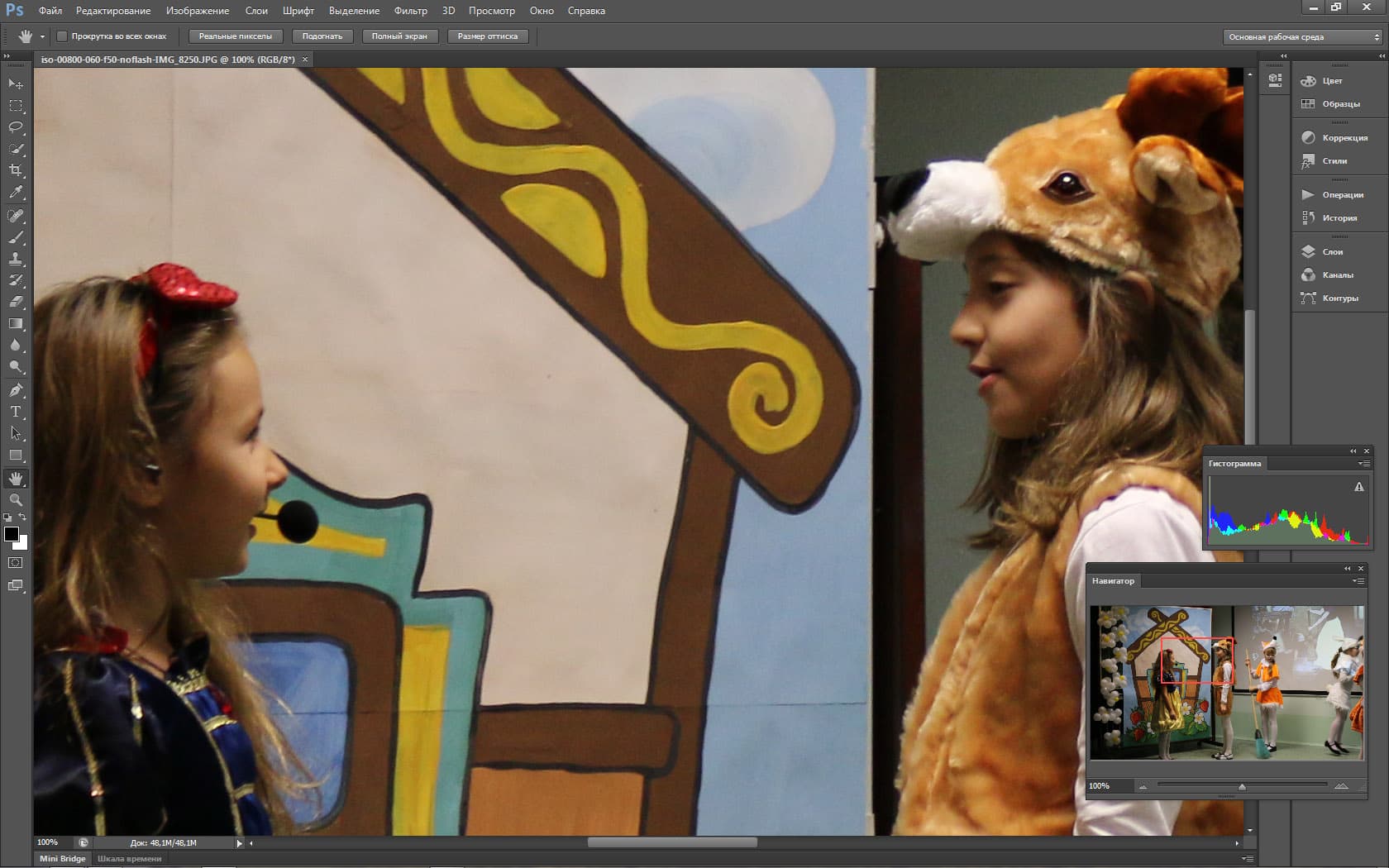 Хотя здесь, возможно, дело в другом. Давайте сравним две фотографии. Обе сделаны с ISO 320, обе — со вспышкой и фокусным расстоянием примерно 50 мм. Никакой «шевеленки» нет — это спокойная съемка, где модели не дергаются и выдержки 1/50 вполне достаточно. Обе фотографии примерно одного плана, среднего. Но при этом у первой прорисовка деталей намного лучше, чем у второй. Она все равно не идеальная, зеркалки на ISO 320 обычно «рисуют» лучше. И похоже, автофокус не промахнулся ни в первой фотографии, ни во второй. Но!!! В дело вмешалась «математика». Насколько я понимаю работу Canon EOS 70D, здесь камера выделила главный объект кадра, и попробовала его «дорисовать». В первом случае это удалось неплохо, во втором — так, на «троечку». Очень похоже, что камера включает «рисующие» алгоритмы уже на невысокой чувствительности (наши тесты на «шумы» это подтверждают), чтобы получить примерно одинаковую картинку в широком диапазоне чувствительности — от 320 до 3200.