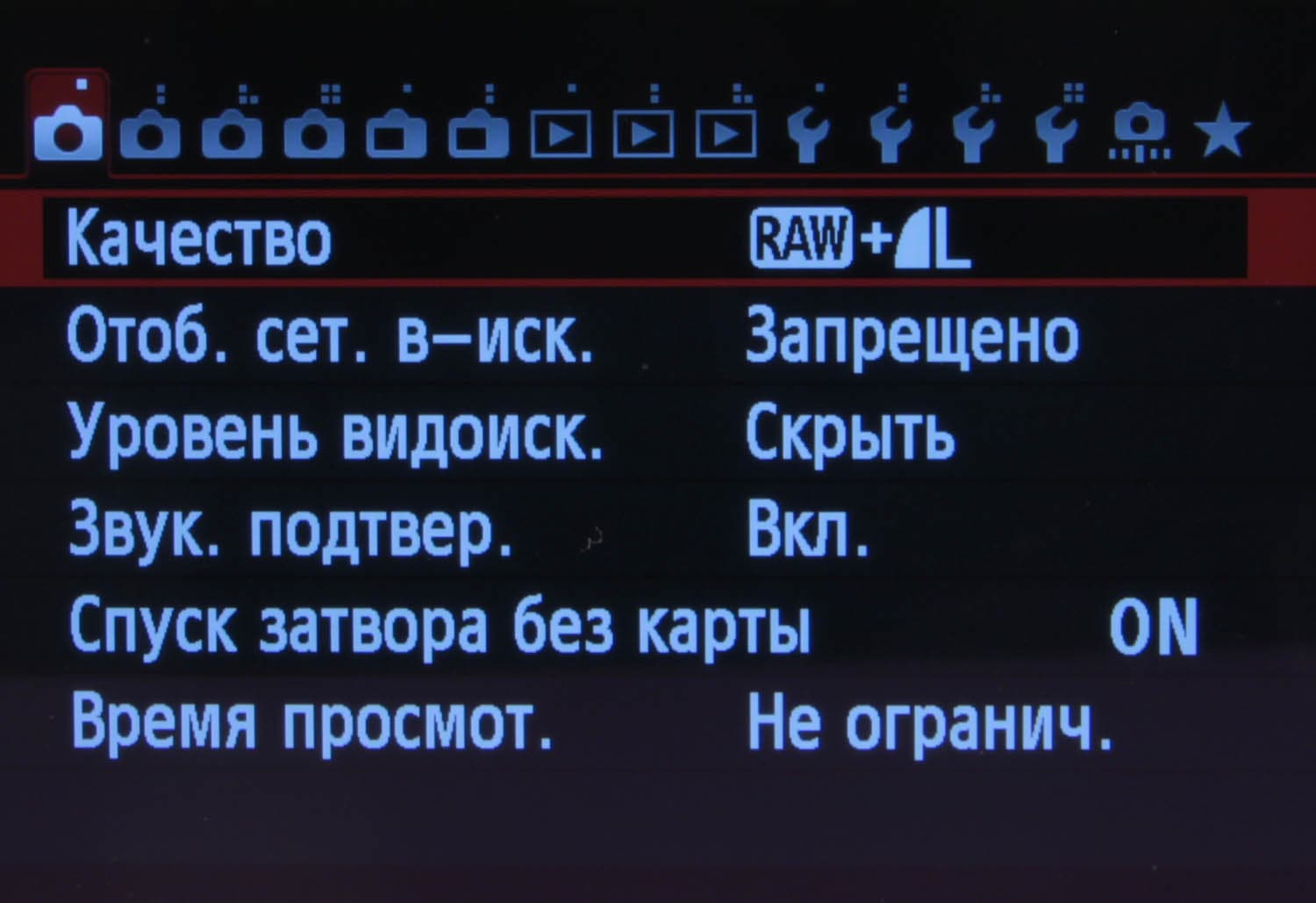 И для более близкого знакомства с камерой желательно просмотреть наиболее интересные пункты меню. Разумеется, Canon EOS 70D, как любая продвинутая камера, дублирует большинство функций меню — их можно вызвать с помощью внешних органов управления. Но некоторые доступны только из меню — либо основного, либо «быстрого», которое вызывается кнопкой «Q». Надо думать, это сокращение от Quick.