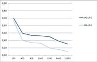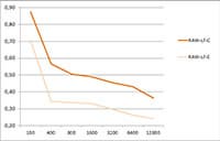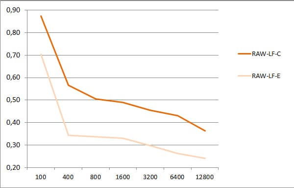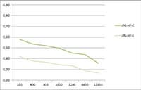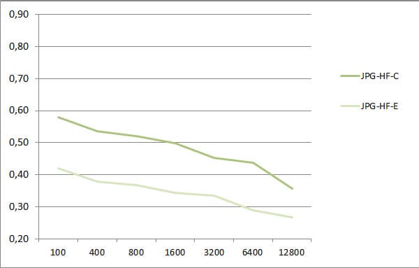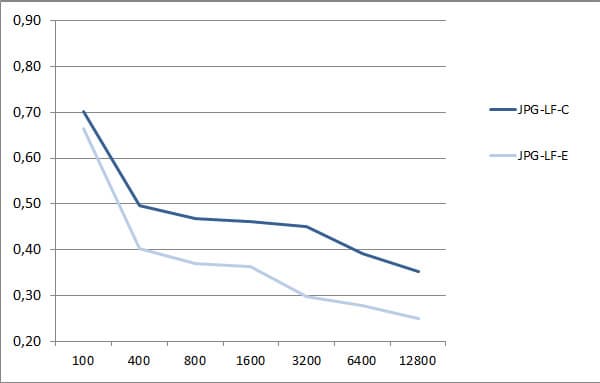 Но дальше, уже на совсем небольшой чувствительности ISO 400, разрешение падает вдвое! Это видно по графикам «RAW — слабый фильтр» и «JPG — слабый фильтр». Причем падение вдвое наблюдается и в центре кадра, и на краю. Честно говоря, такого на ISO 400 я еще не видел — по меркам зеркалок это очень небольшая чувствительность. И это сложно объяснить иначе, как несовершенной «математикой». Это никакая не «мазанка» — при выдержке 1/500 секунды и еще короче любая «мазанка» пропадает. Это вряд ли сильно шумящая матрица — с какой стати матрица будет шуметь сильнее на краях, чем в центре кадра? Это не оптика — следующий за шумами тест оптики покажет, что на минимальной чувствительности недорогой китовый объектив работает очень достойно (по крайней мере, на фокусном расстоянии 35 мм и диафрагме f/7,1, на которых снимались «шумы»).