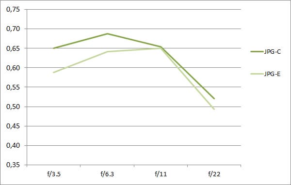 - На минимальном фокусном расстоянии ФР=18 разрешение вплоть до f/18 держится на уровне 0,6—0,7 линий на пиксель. И только на минимальной диафрагме f/22 падает до 0,5. Другими словами, на минимальном фокусном расстоянии разрешение в любом случае остается высоким (хотя минимальной диафрагмой лучше не пользоваться).