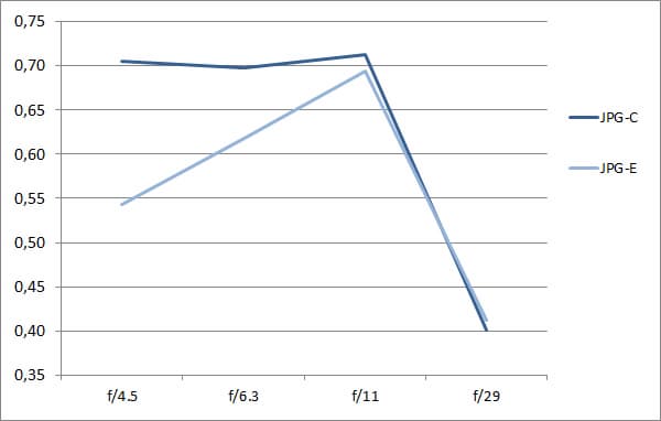- На среднем фокусном расстоянии ФР=35 разрешение также остается высоким вплоть до f/20. И только на самых узких диафрагмах стремительно падает — до 0,4 на f/29. То есть падения до 0,4 линий на пиксель, которое мы наблюдали при чувствительности ISO 400, по вине оптики быть никак не могло. На диафрагме f/7,1 разрешение должно было быть порядка 0,7 линий на пиксель, очень близко к максимуму.