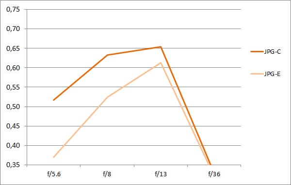 - На максимальном фокусном расстоянии ФР=55 мы наблюдаем невысокое разрешение на открытой диафрагме f/5,6, потом разрешение растет до 0,55—0,65 на диафрагмах f/8—20, а потом резко падает до 0,3 линий на пиксель.