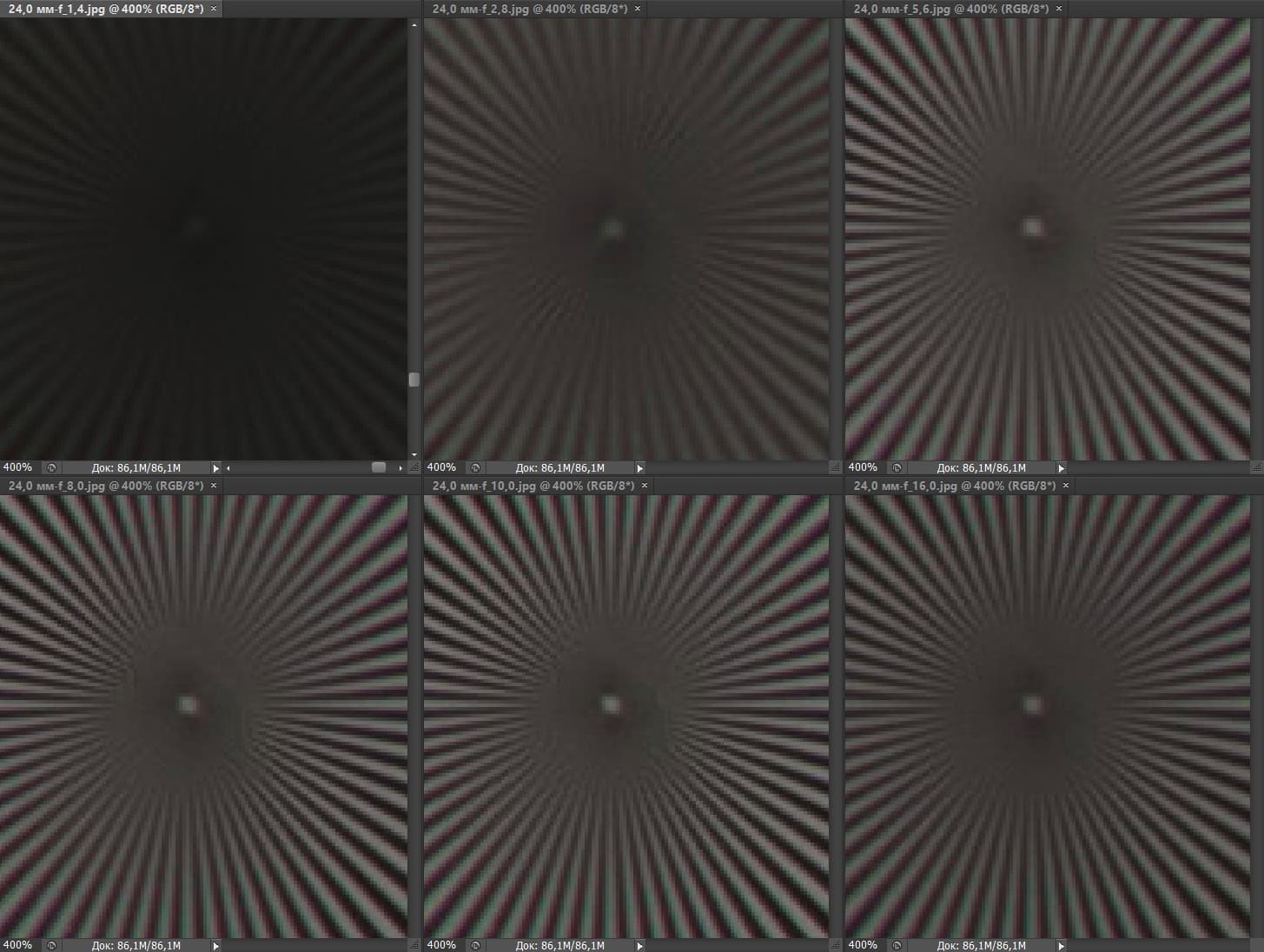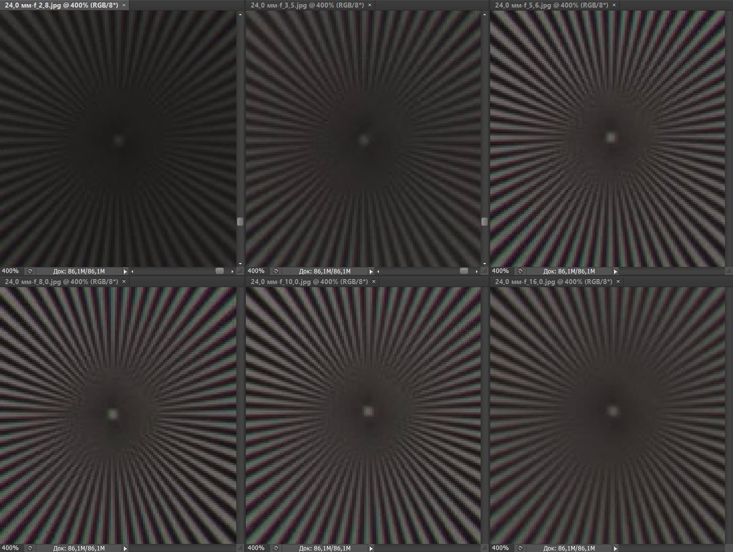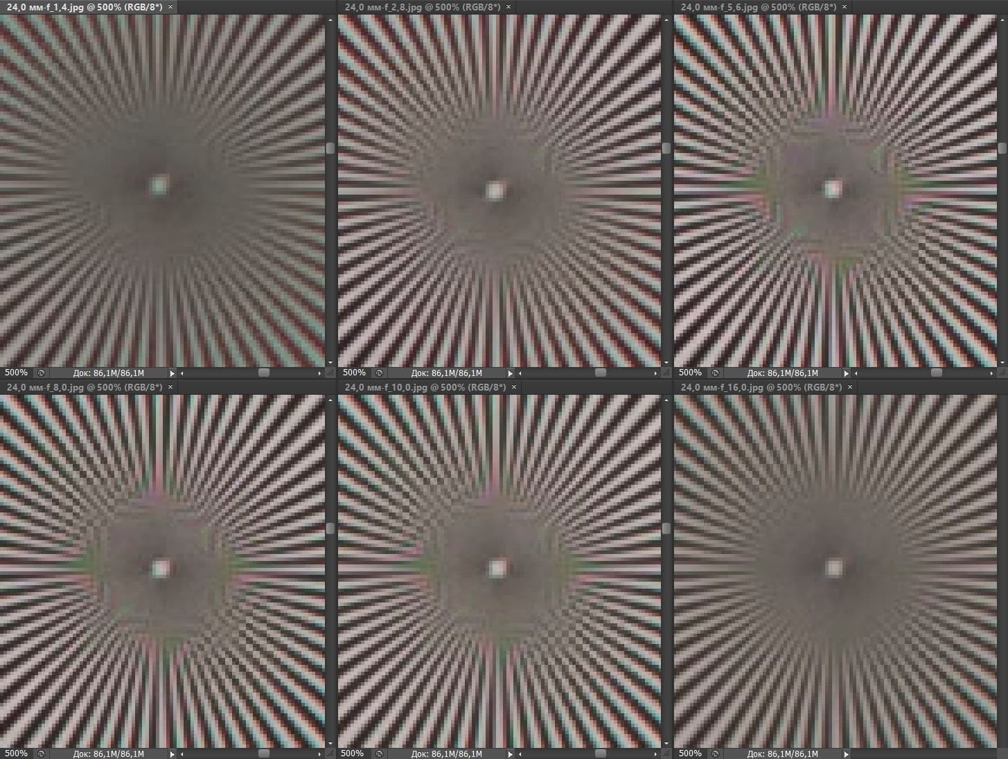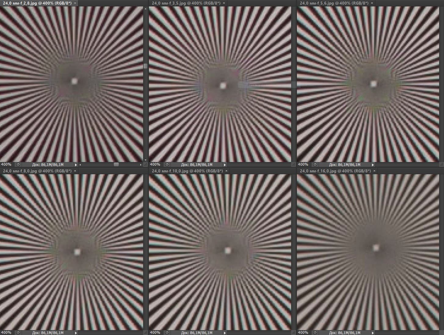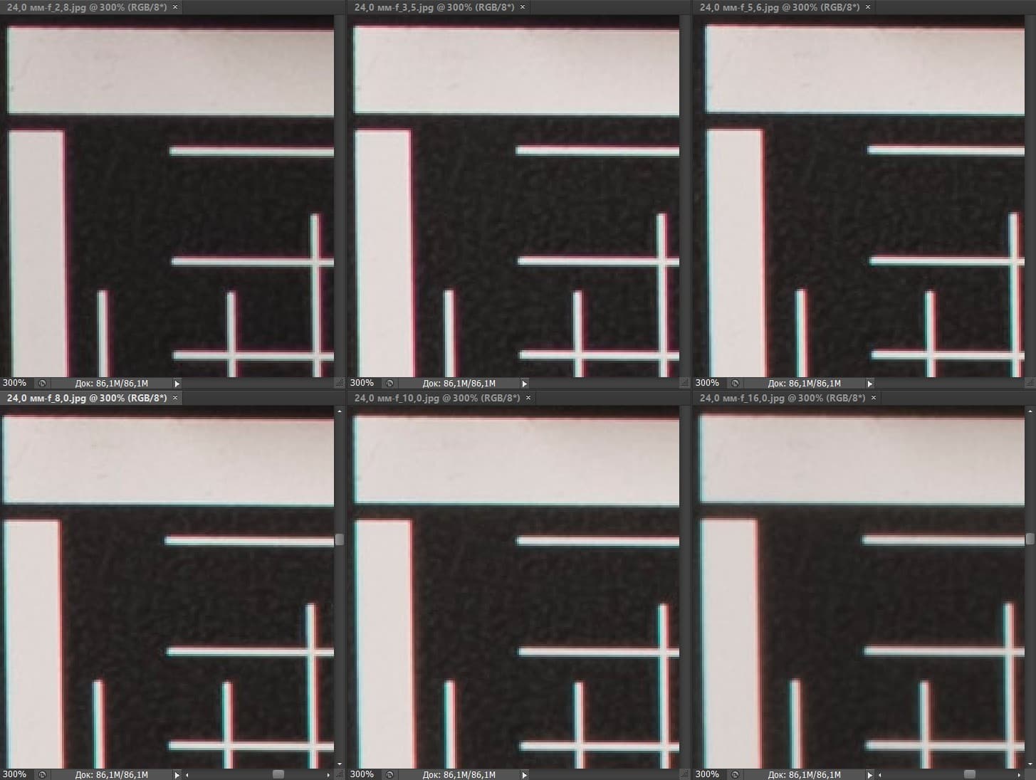 Стендовые съемки традиционно проводились в RAW, после чего подвергались проявке с использованием последних профилей Adobe. В ходе этого процесса слабые хроматические аберрации в центре кадра, которые в «камерном» JPEG были едва заметными, отчетливо визуализировались по вине проявщика и использованного им профиля объектива. Впрочем, в углах кадра хроматические аберрации достаточно заметные у обоих объективов. Несмотря на центрально-взвешенный режим экспозамера, на открытых диафрагмах углы получаются очень темными. Насколько такой перепад освещенности критичен, покажут только полевые снимки. Подобная виньетка возникает у обоих объективов на открытых диафрагмах, а с ее прикрытием практически пропадает. Если браться за оценку светопропускания, то в обоих случаях оно одинаковое в пределах погрешности измерения, так что оценить относительную эффективность просветляющих покрытий сложно.