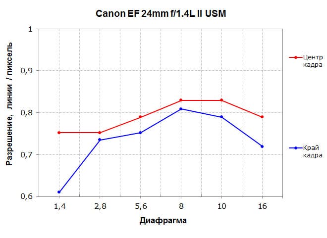 Резкость в центре практически одинаковая у обоих испытуемых при всех сравнимых степенях диафрагмирования. А вот на периферии картина явно не пользу «старшего брата»: при F2,8—F4 он сильно уступает Canon EF 24mm f/2.8 IS USM, демонстрируя то, что на фотожаргоне обычно именуют «мылом» (хотя F2,8 — далеко не максимальное для этого объектива значение диафрагмы). Оговоримся: вполне возможно, что в столь демонстративном отставании Canon EF 24mm f/1.4L II USM от младшего соперника виновата специфика конкретного (неудачного) экземпляра объектива.