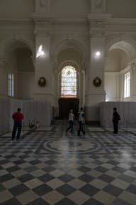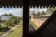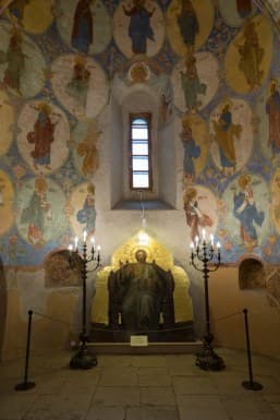 Видимой на глаз разницы в балансе белого нам выявить не удается. Но в таком «противосолнечном» сюжете воспроизведение цветов вообще сильно страдает из-за высокого контраста, поэтому цветопередачу в этой серии оценивать не стоит. Лучше возьмем другой сюжет: сцену в Преображенском соборе суздальского Спасо-Евфимиевого монастыря. Здесь иногда проводят службы, но в основном это экспозиция Суздальского музея-заповедника, куда водят толпы иностранных туристов. Этот сюжет мы снимали при одинаковых параметрах: F2,8; 1/30 c; ISO 320. Благодаря тому, что для освещения использованы светодиодные лампы, коррекции АББ не потребовалось. Верхние снимки — без коррекции, нижние — с коррекцией при помощи соответствующих профилей объективов.