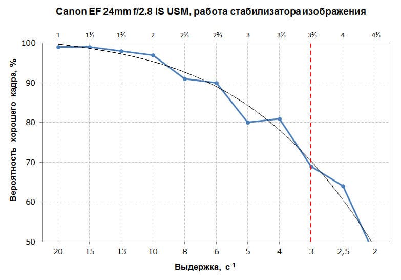 Canon EF 24mm f/2.8 IS USM оснащен стабилизатором изображения. Производитель обещает эффективность в 4 ступени EV. Тестирование по нашей методике дает оценку эффективности в 3⅔, что очень близко к заявленной.