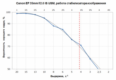 Canon EF 35mm f/2 IS USM оснащен стабилизатором изображения, эффективность которого производитель декларирует как выигрыш в четыре ступени экспозиции. Тестирование по нашей методике дает оценку эффективности в 3⅓, что достаточно близко к заявленной.
