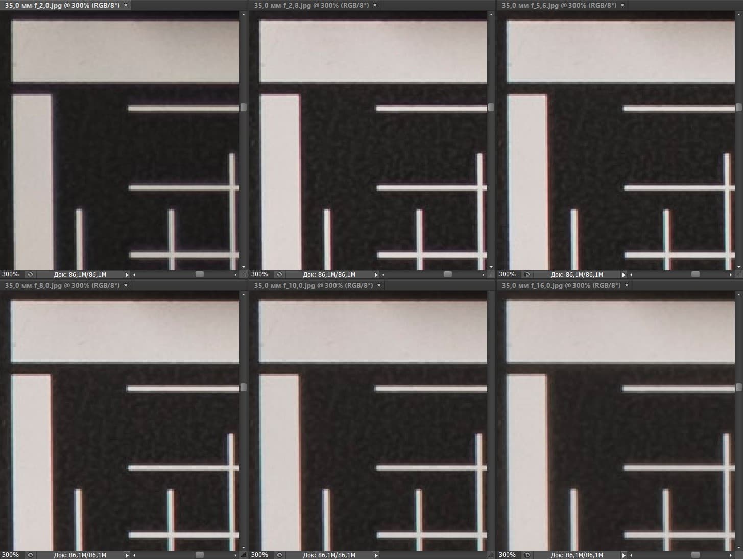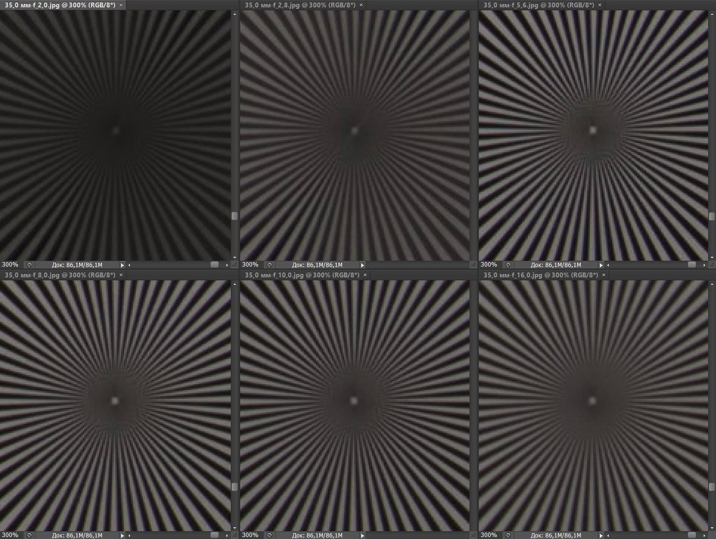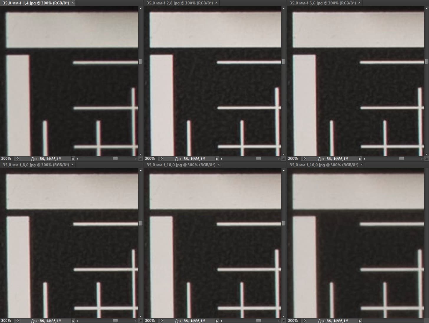 Для каждого значения диафрагмы приведем четыре фотографии: первая пара — результат «проявки» без коррекции с помощью стандартных профилей объективов, вторая пара — с использованием таких профилей.