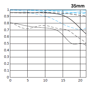 | Графики MTF (данные производителя): черный цвет — F2, синий цвет — F8; толстые линии — 10 линий/мм, тонкие — 30 линий/мм; сплошные кривые — для сагиттальных структур, пунктирные — для тангенциальных. В целом, рисунок MTF у Canon EF 35mm f/2 IS USM впечатляет меньше. | |