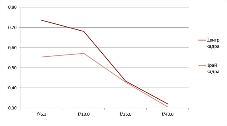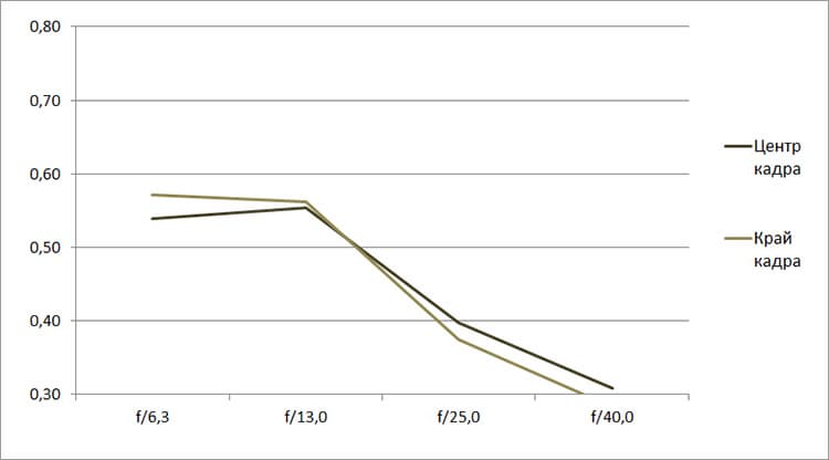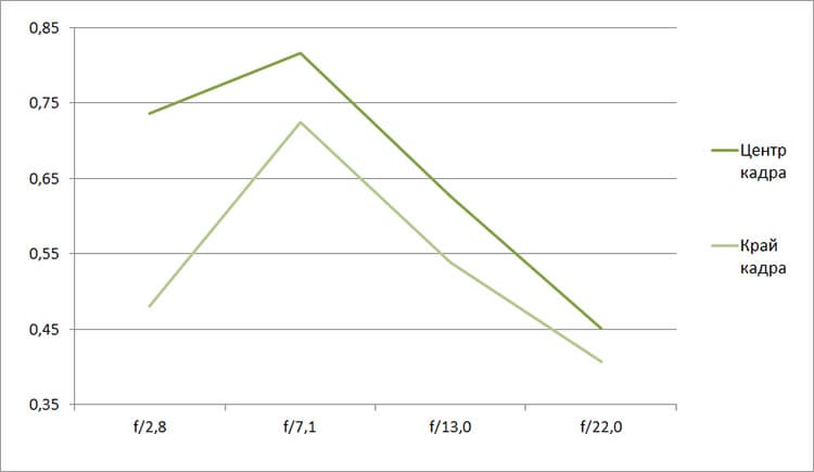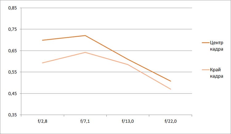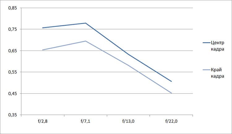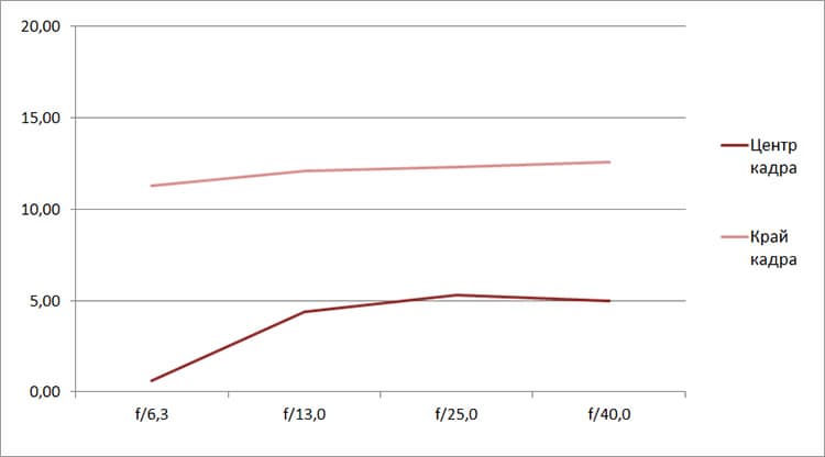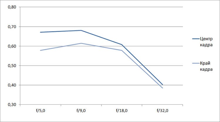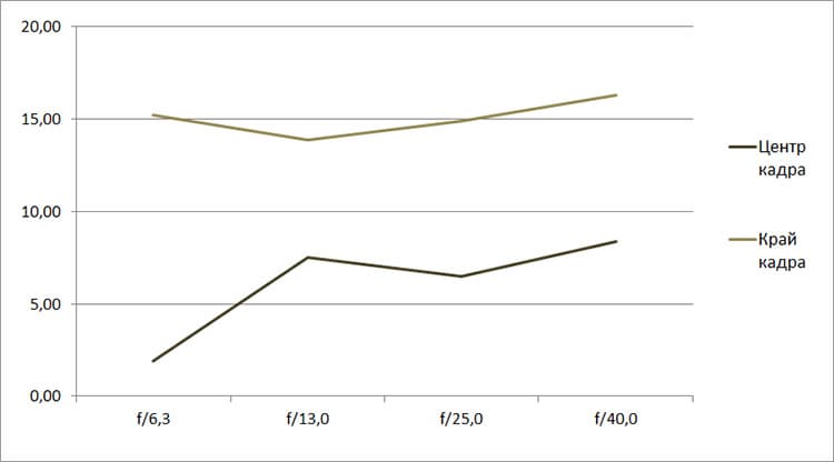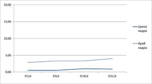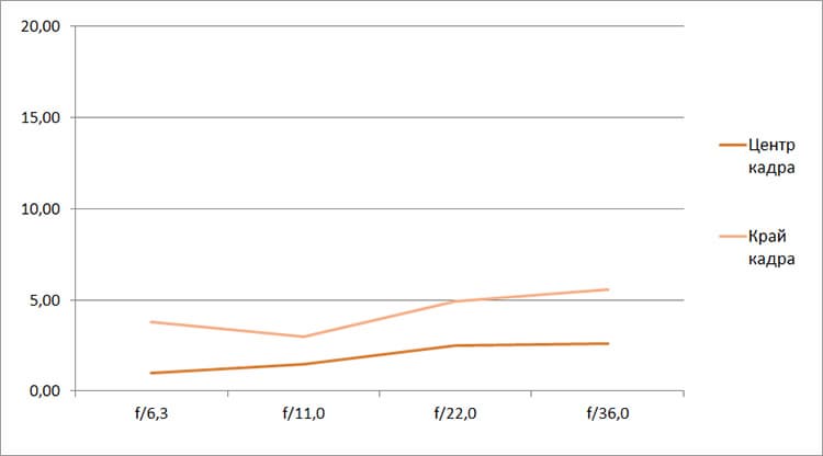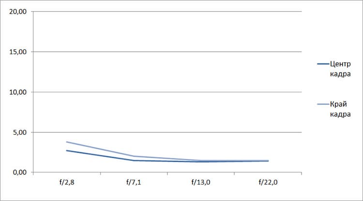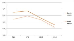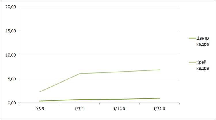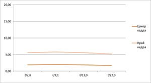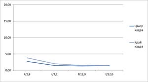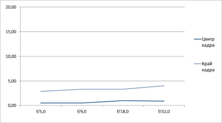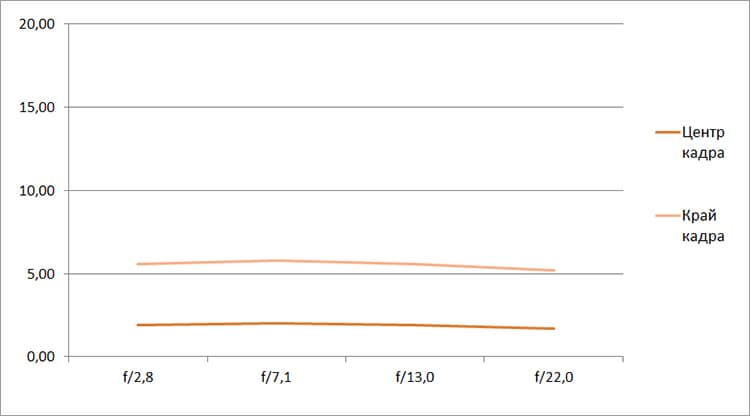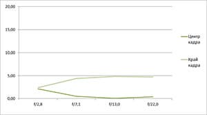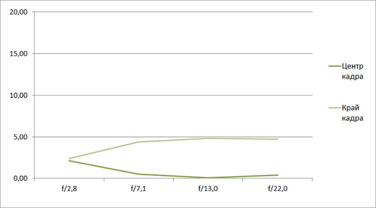 Разрешение в диапазоне f/5.0—f/22 остается в рамках 0,5—0,7 линий на пиксель. А при уменьшении диафрагмы до f/32 закономерно снижается до 0,4. Граждане! Не используйте диафрагму у́же f/22! Уровень хроматических аберраций на этом фокусном расстоянии падает — даже на краю кадра «хроматика» не превышает 4 процентов.