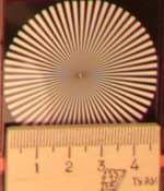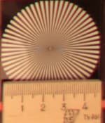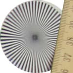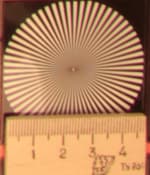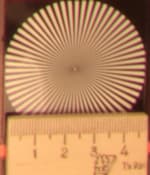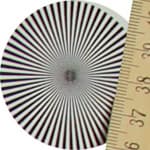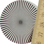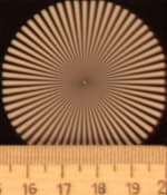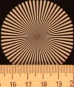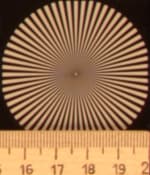 Радиальные миры, по которым определялось разрешение, можно рассмотреть детально: в верхнем ряду таблицы даны тестовые снимки миры в центре кадра, во втором ряду — на краю. Здесь хорошо видно, что разрешение при диафрагме f/3,2 находится на уровне 0,6 линий на пиксель, потом, на средних диафрагмах, оно чуть увеличивается — почти до 0,7 линий, и на узкой диафрагме f/22 падает до 0,5 линий на пиксель.