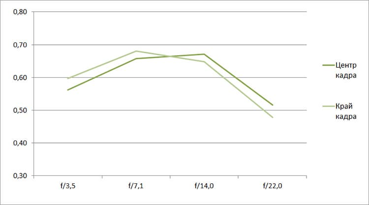 Разрешение на этом фокусном расстоянии остается довольно высоким, отчасти потому, что минимальная диафрагма относительно большая — f/22. И в центре, и на краю кадра разрешение укладывается в диапазон 0,5—0,7 линий на пиксель. Не блестящий, но вполне приемлемый результат.
