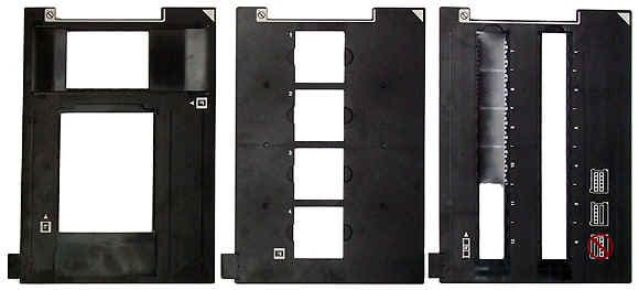 Для крепления пленок прилагаются три черных шаблона, которые укладываются на стекло сканера. Шаблоны никак не крепятся к сканеру и при столь высокой точности сканирования всегда есть риск, что в процессе его они сдвинутся. Поэтому устанавливать сканер надо строго горизонтально, а еще лучше крепить шаблоны клейкой лентой. Шаблоны представляют собой окна с пазами, в которые вставляется пленка. При этом между пленкой и стеклом сканера остается зазор в 1-2 мм. Таким образом, исключается возможность возникновения колец Ньютона. У сканеров этого класса это одно из самых удобных креплений, которые мне встречались, хотя ему и далеко до тех, которыми снабжаются профессиональные сканеры. Шаблоны предназначены для использования двух отрезков 35 мм пленки, среднеформатной пленки тип 120, размер окна 6×9 см. К сожалению, в шаблоне только одно такое окно, поэтому придется заряжать каждый кадр в отдельности. Для сканирования единичного кадра меньшего размера (6×6, 6×4,5 см) придется вырезать дополнительный черный экран, перекрывающий оставшееся незаполненным пространство. Остальная часть этого шаблона предназначена для установки форматных пленок 4×5 дюймов. Еще один шаблон предназначен для сканирования 35 мм диапозитивов в рамках.