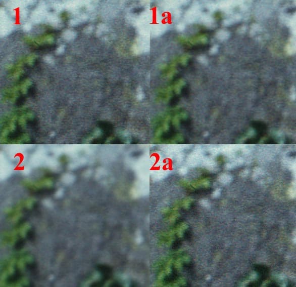 1 — использование режима Unsharp Mask в драйвере сканера. 2 — Unsharp Mask в драйвере сканера выключен. 1а — размытие изображения 1 в графическом редакторе. 2а — использование фильтра Unsharp Mask в графическом редакторе. |