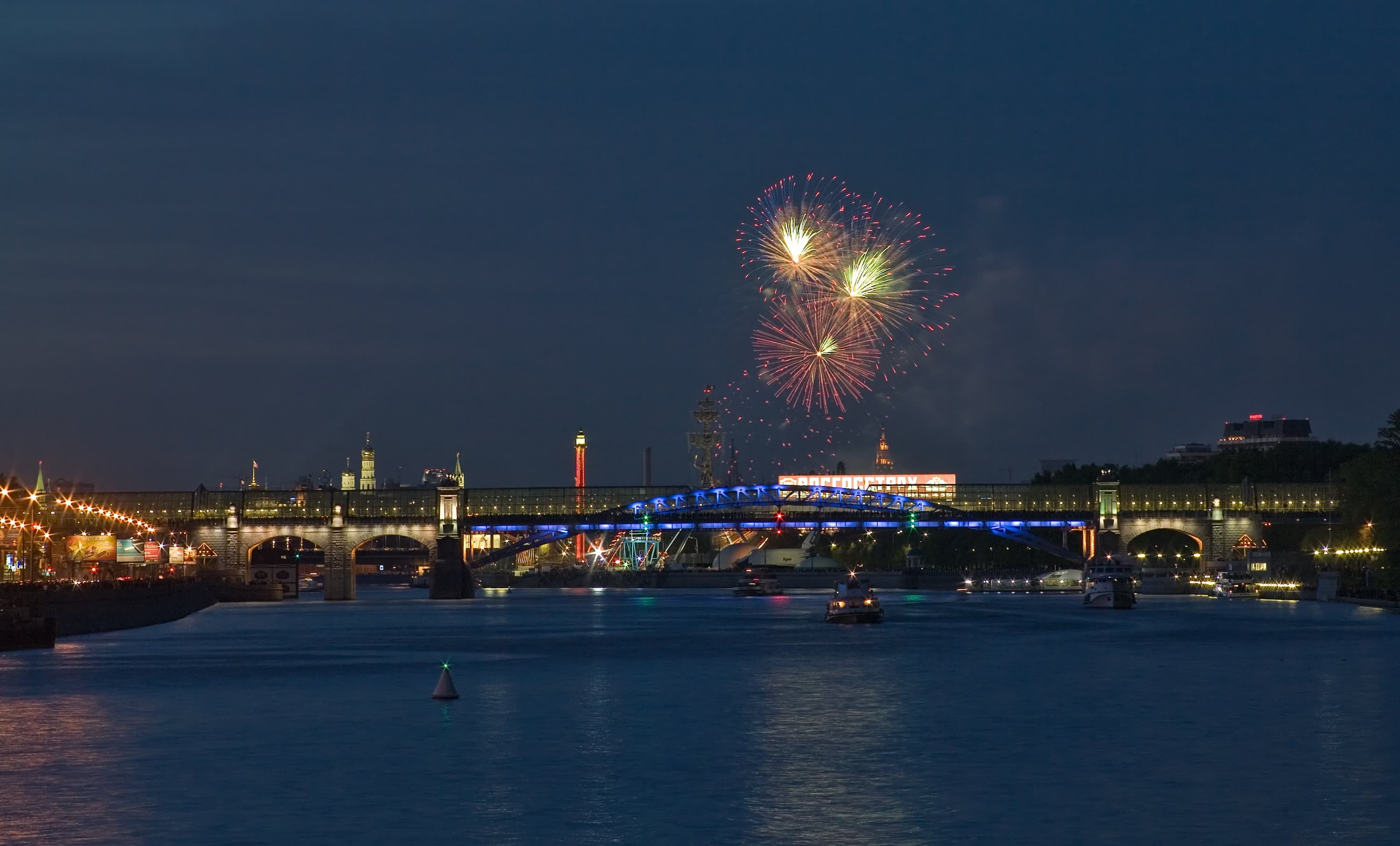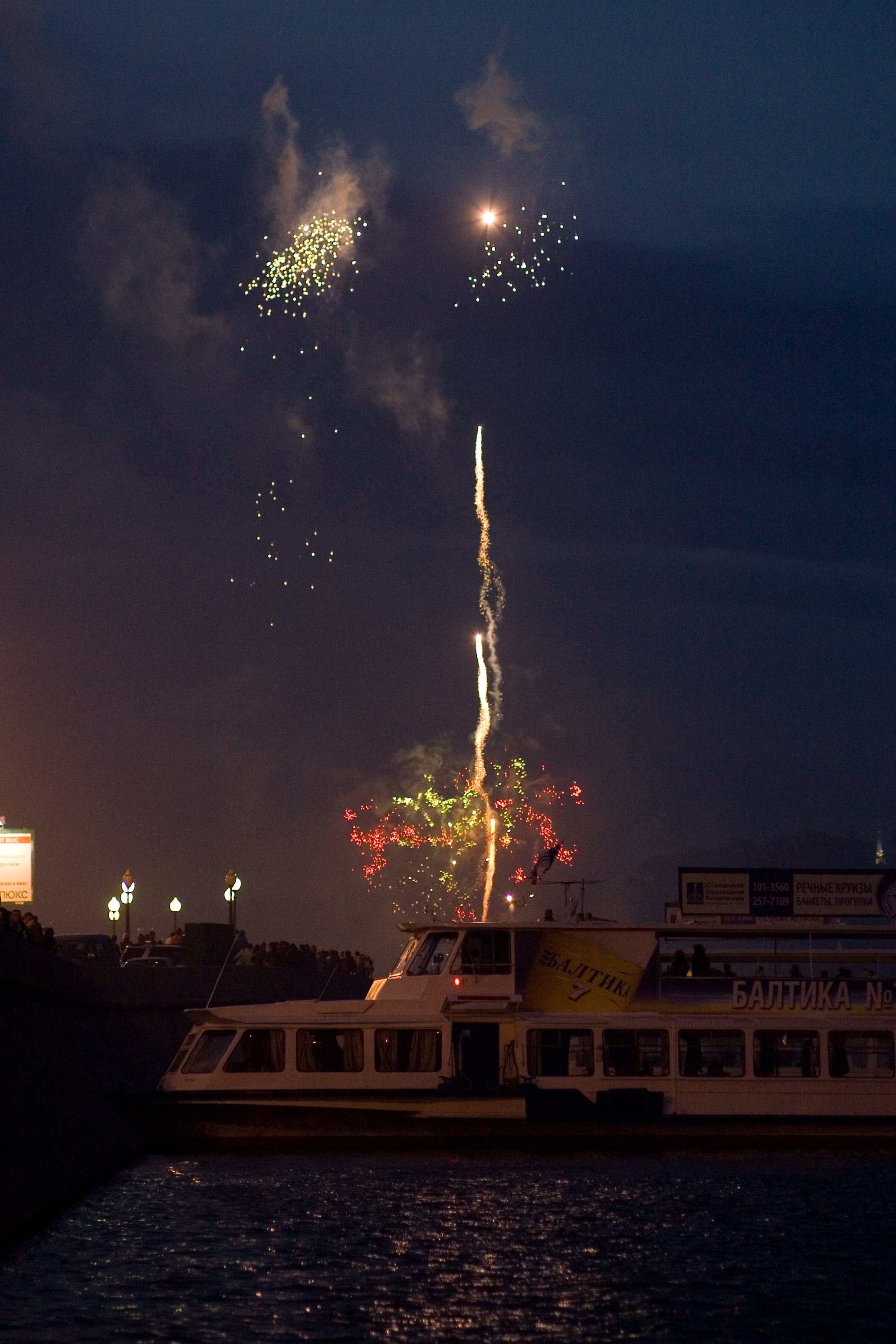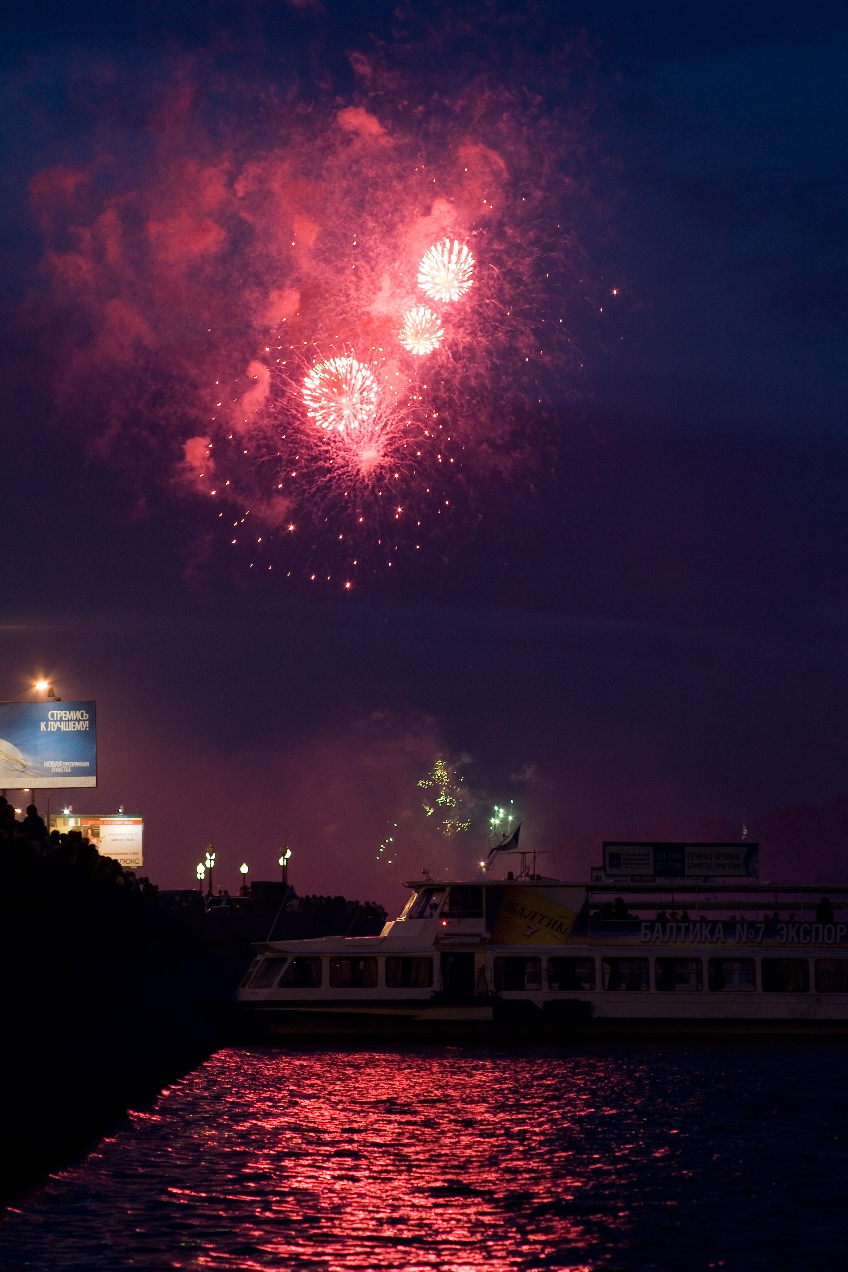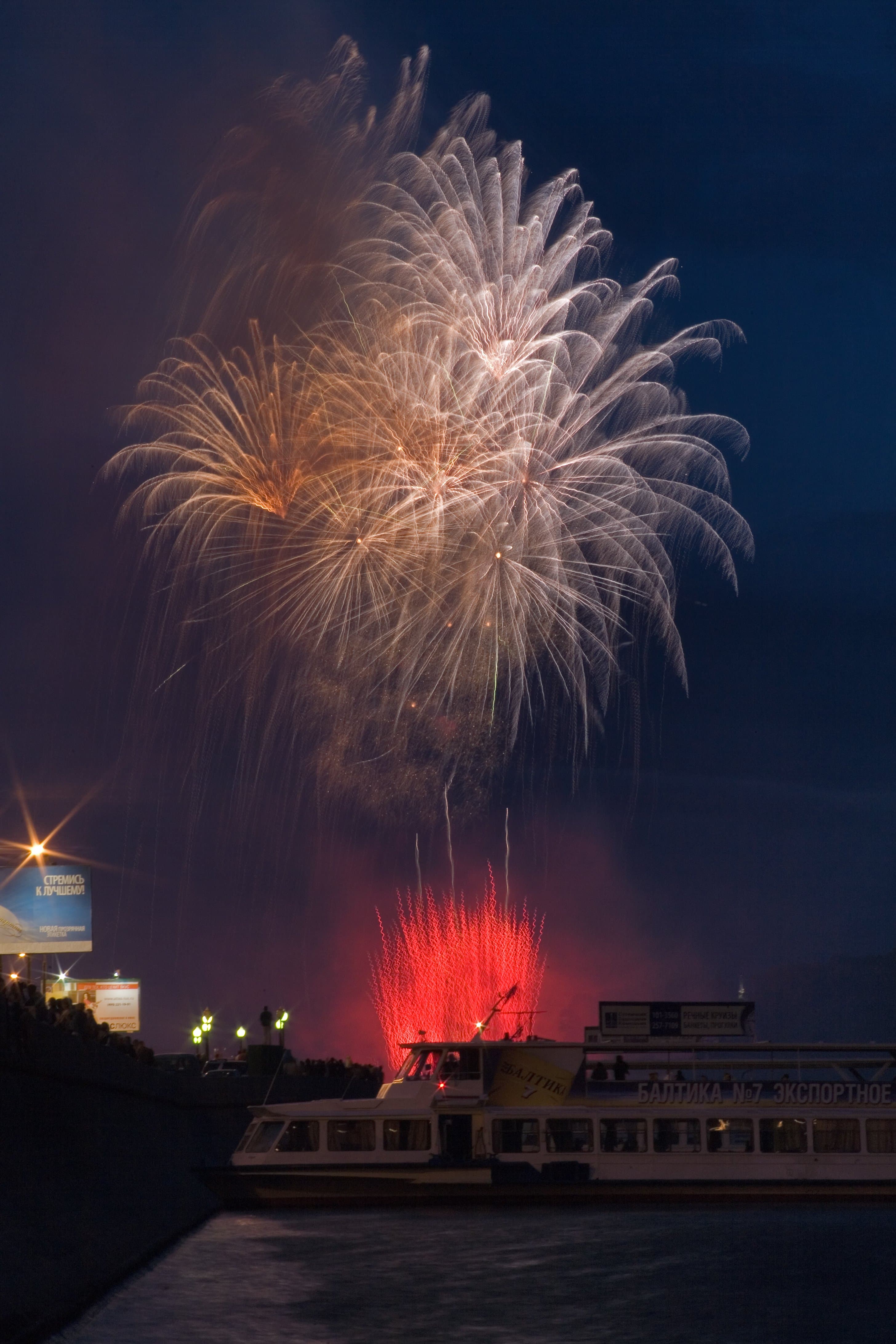 На удивление место оказалось абсолютно пустым, я установил штатив Mаnfrotto 190PROB на гранитное основание опоры моста, штатив был с металлическими шипами и мне всегда казался очень устойчивым. К камере Canon EOS 5D был подключен ИК пульт дистанционного управления, во время съемок я использовал объективы с фокусным расстоянием 50 и 135 мм. Особенность фестиваля фейерверков в том, что залпы следуют один за другим, фактически в любой момент времени что-нибудь в небе да сияет. Выдержка варьировалась от 1/60 с до 20 с. Снимки сделаны зеркальной камерой с объективами, допускающими значительное диафрагмирование.Конечно, при диафрагме F:32 уже сказывается дифракция и все пылинки становятся очень заметными, но удается довести выдержку до 20 секунд. При съемке компактной камерой для получения длительных выдержек приходится использовать нейтральный фильтр. Примеры подобных снимков, сделанных на предыдущем фестивале фейерверков, можно посмотреть в статье, посвященной камере Concord Eye-Q 3132Z.