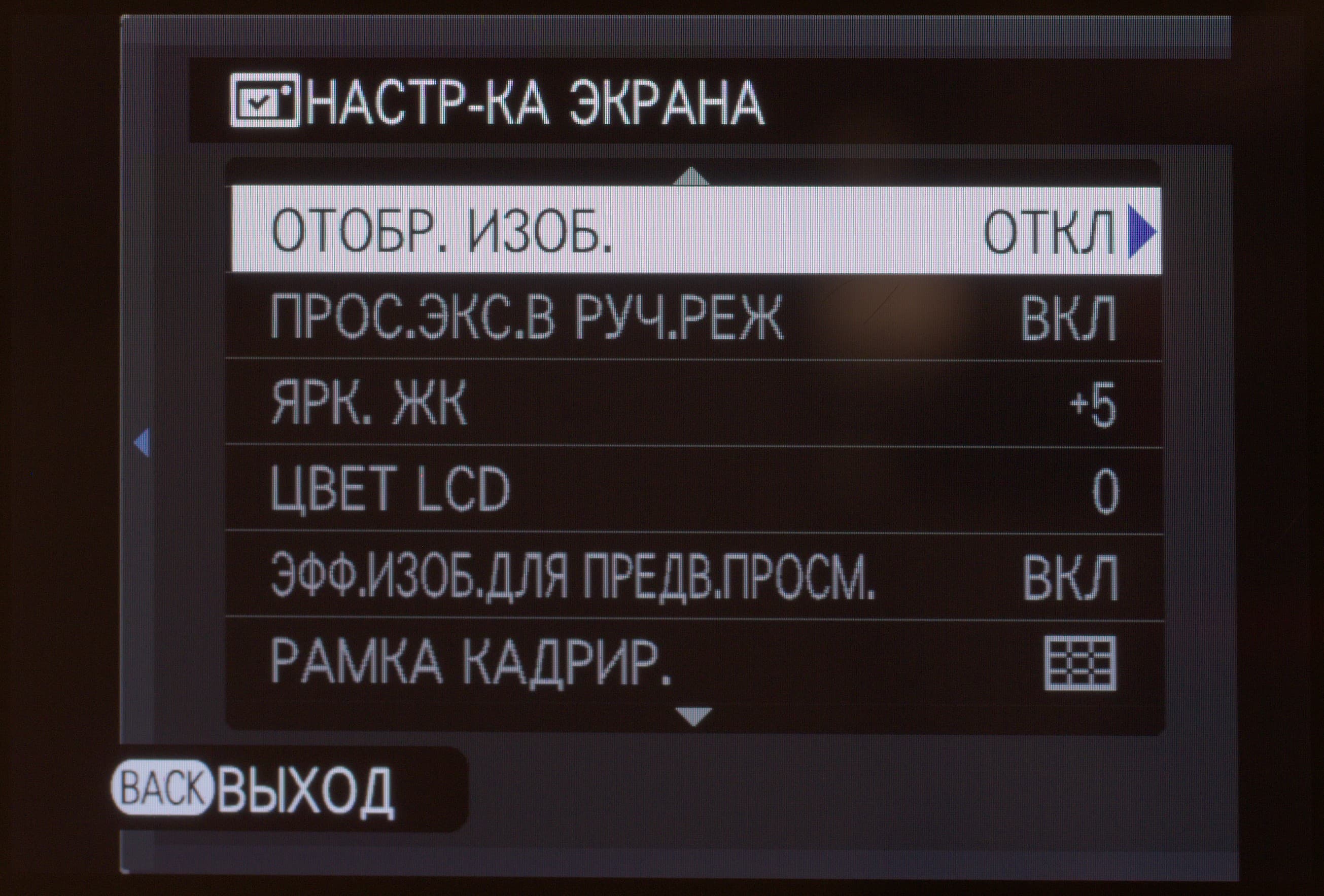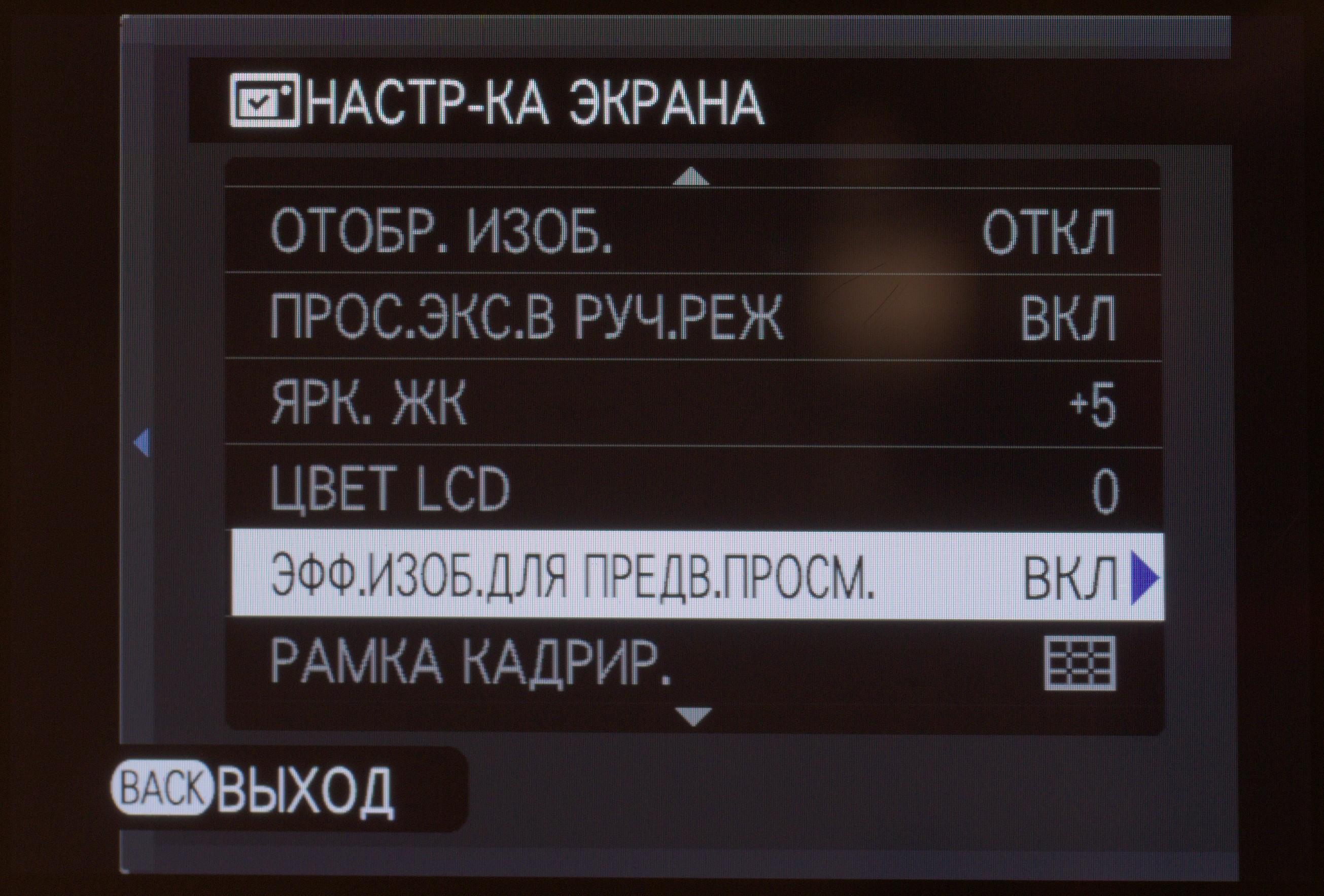 | Режимы моделирования фотопленки Fujifilm | 11 видов: Provia (стандартный), Velvia (усиленный), Astia (мягкий), Classic Chrome, Pro Neg Hi, Pro Neg Std, Monochrome, Monochrome +Ye (с желтым светофильтром), Monochrome+R (с красным светофильтром), Monochrome +G (с зеленым светофильтром), сепия |