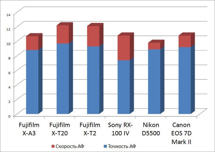 | Контрастный или гибридный АФ | Fujifilm X-A3 | Fujifilm X-T20 | Fujifilm X-T2 | Sony RX-100 IV | Nikon D5500 | Canon EOS 7D Mark II |