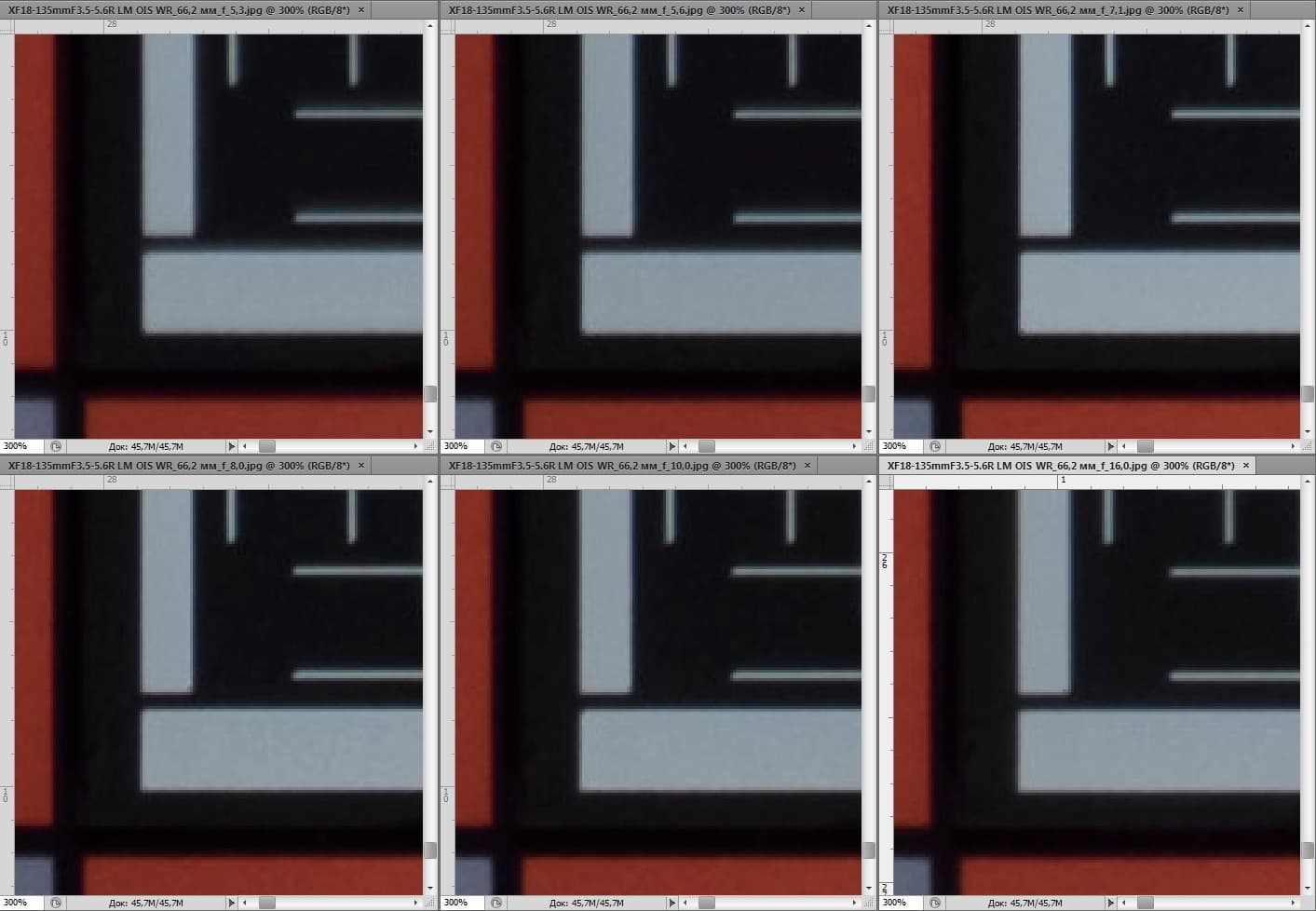 Резкость практически та же, что и в предыдущих сериях, хотя контраст освещения выше, и кажется, что в центре кадра детали более четкие. У краев кадра видим ту же картину, что и в предыдущих сериях: понижение резкости по сравнению с центром, причем оно заметнее при минимальном и максимальном фокусных расстояниях. Эта «краевая мутность» на периферии несколько уменьшается начиная с фокусного 47 мм и примерно до 88 мм, после чего разница в резкости в пользу центра снимков вновь возрастает.