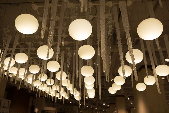В условиях освещения лампами накаливания автоматика не до конца четко отрабатывает баланс белого, но это не столь важно, так как легко корректируется при постобработке. Ценно другое: отличная передача полутонов с сохранением всего богатства градаций. Даже в самых ярких зонах плафонов ламп сохранены детали; ничто не «выбито». В равной мере и области теней содержат все подробности поверхностей декоративных сосулек.