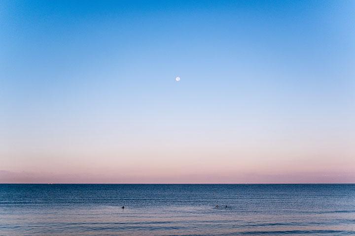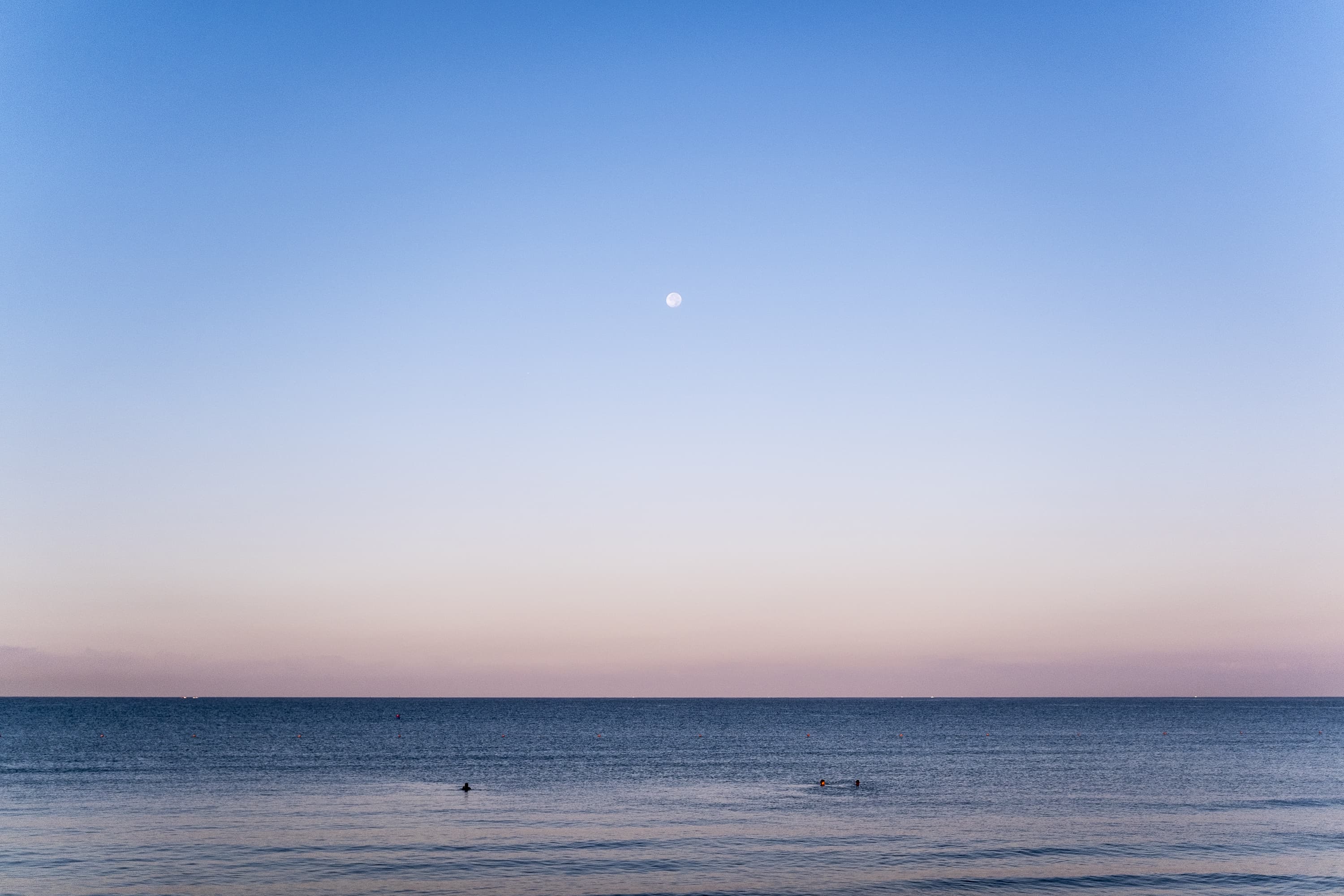 Объективу удалось воспроизвести замечательные по тонкости и нежности цветовой и светотональный переходы от лилового к синему над морем, хорошо различимую почти полную луну, стоящую довольно высоко в небе, и сгущающуюся от переднего плана к горизонту плотность ряби на поверхности воды.