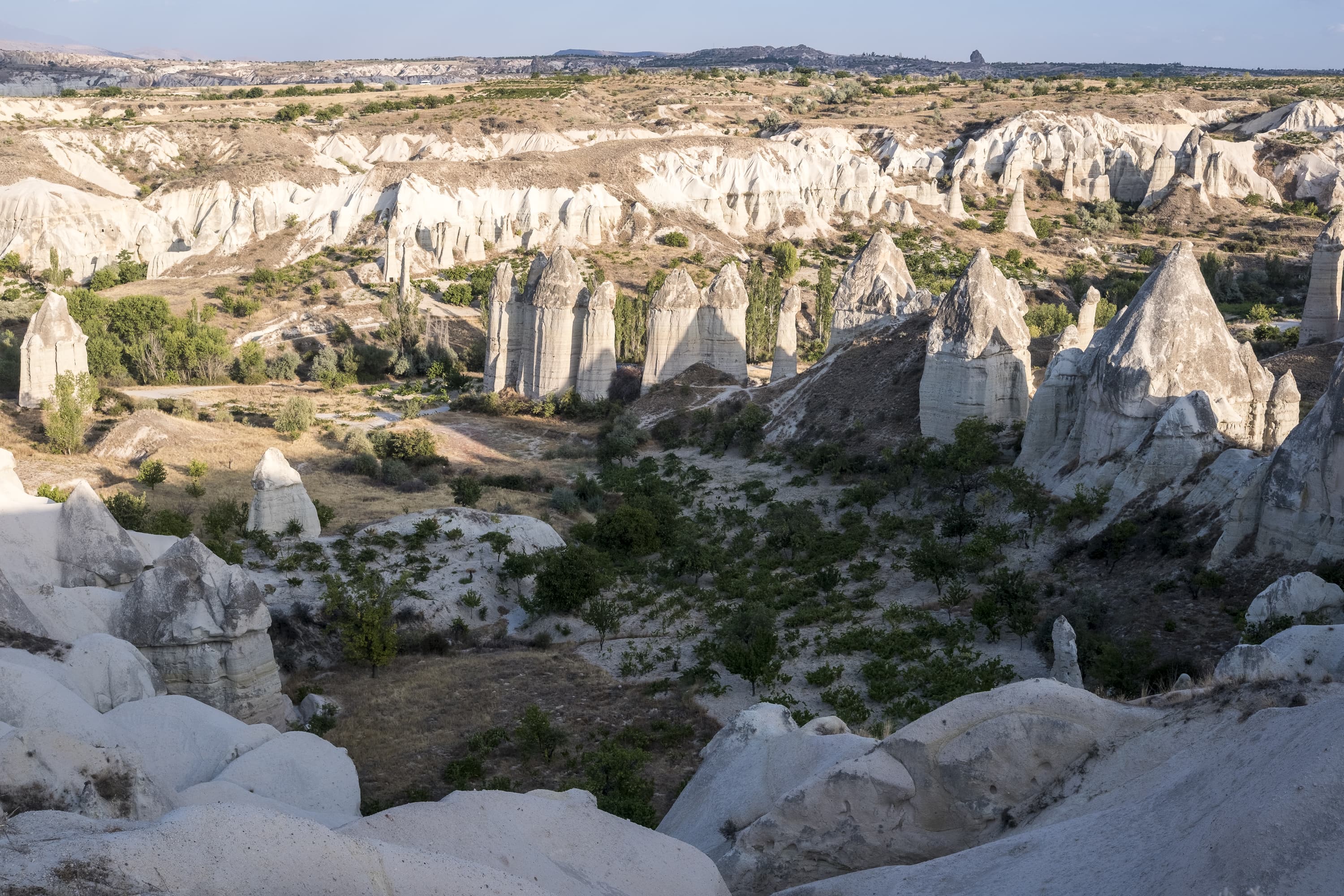На заднем плане видны удаленные шапки гор, кусты и виноградники и даже припаркованный белый микроавтобус, а справа на горизонте — постройки поселка, водонапорная башня и гора крепости Ортахисар.